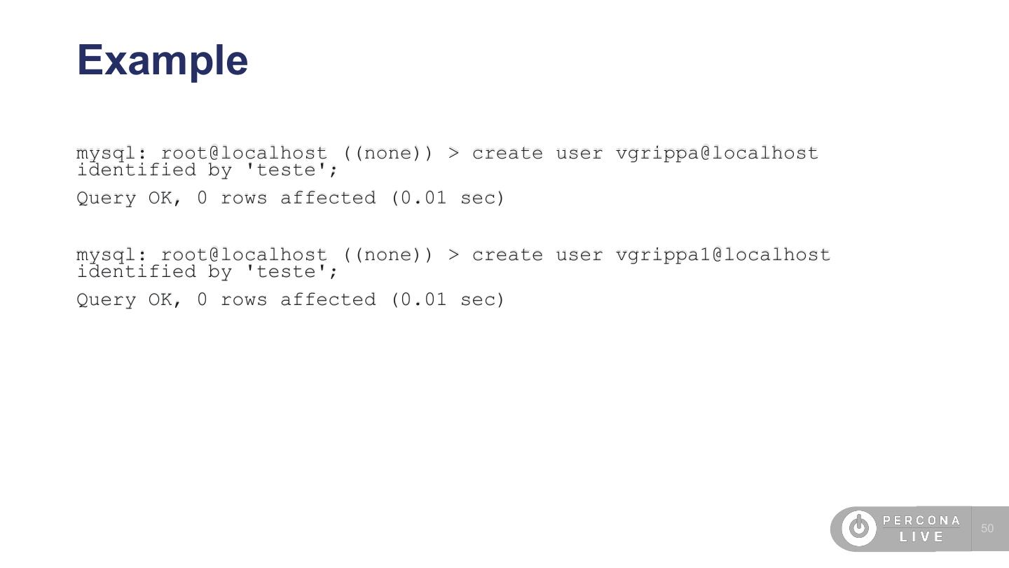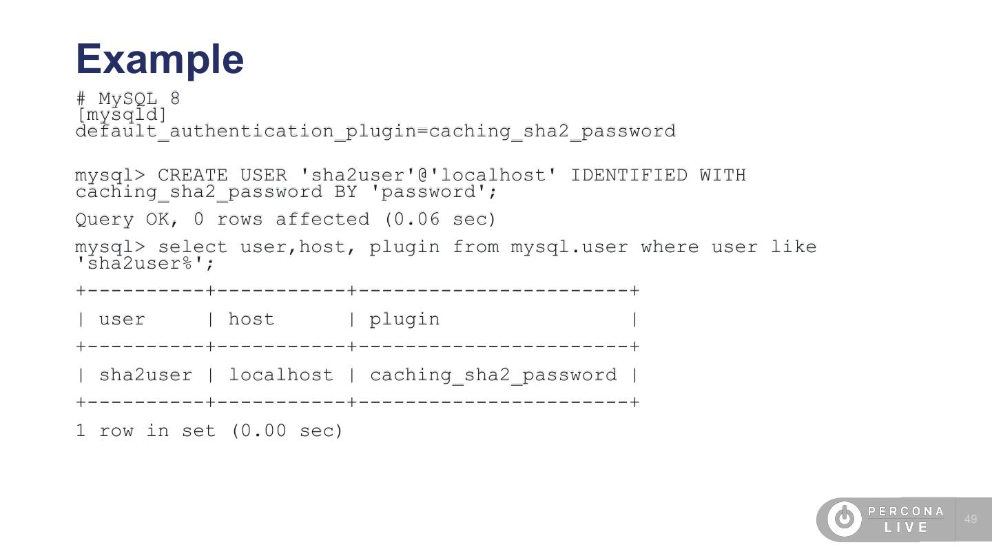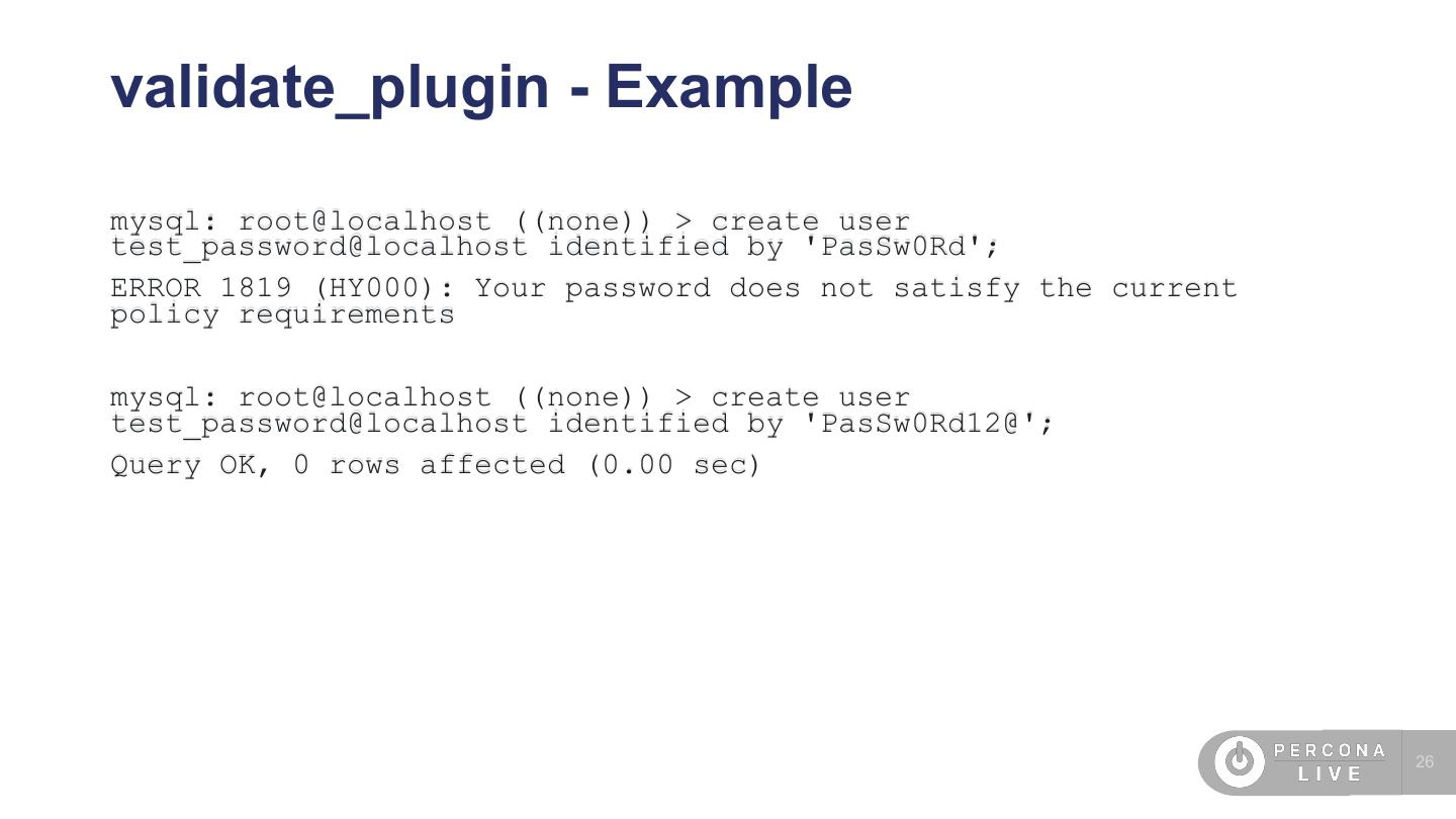 26 .validate_plugin - Example mysql: root@localhost ((none)) > create user test_password@localhost identified by 'PasSw0Rd'; ERROR 1819 (HY000): Your password does not satisfy the current policy requirements mysql: root@localhost ((none)) > create user test_password@localhost identified by 'PasSw0Rd12@'; Query OK, 0 rows affected (0.00 sec) 26
