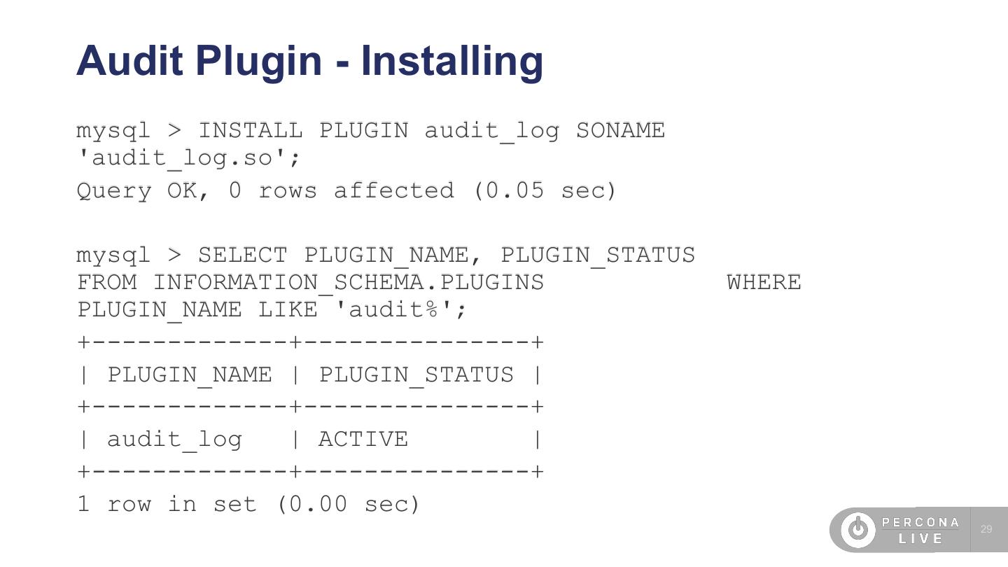 29 .Audit Plugin - Installing mysql > INSTALL PLUGIN audit_log SONAME 'audit_log.so'; Query OK, 0 rows affected (0.05 sec) mysql > SELECT PLUGIN_NAME, PLUGIN_STATUS FROM INFORMATION_SCHEMA.PLUGINS WHERE PLUGIN_NAME LIKE 'audit%'; +-------------+---------------+ | PLUGIN_NAME | PLUGIN_STATUS | +-------------+---------------+ | audit_log | ACTIVE | +-------------+---------------+ 1 row in set (0.00 sec) 29