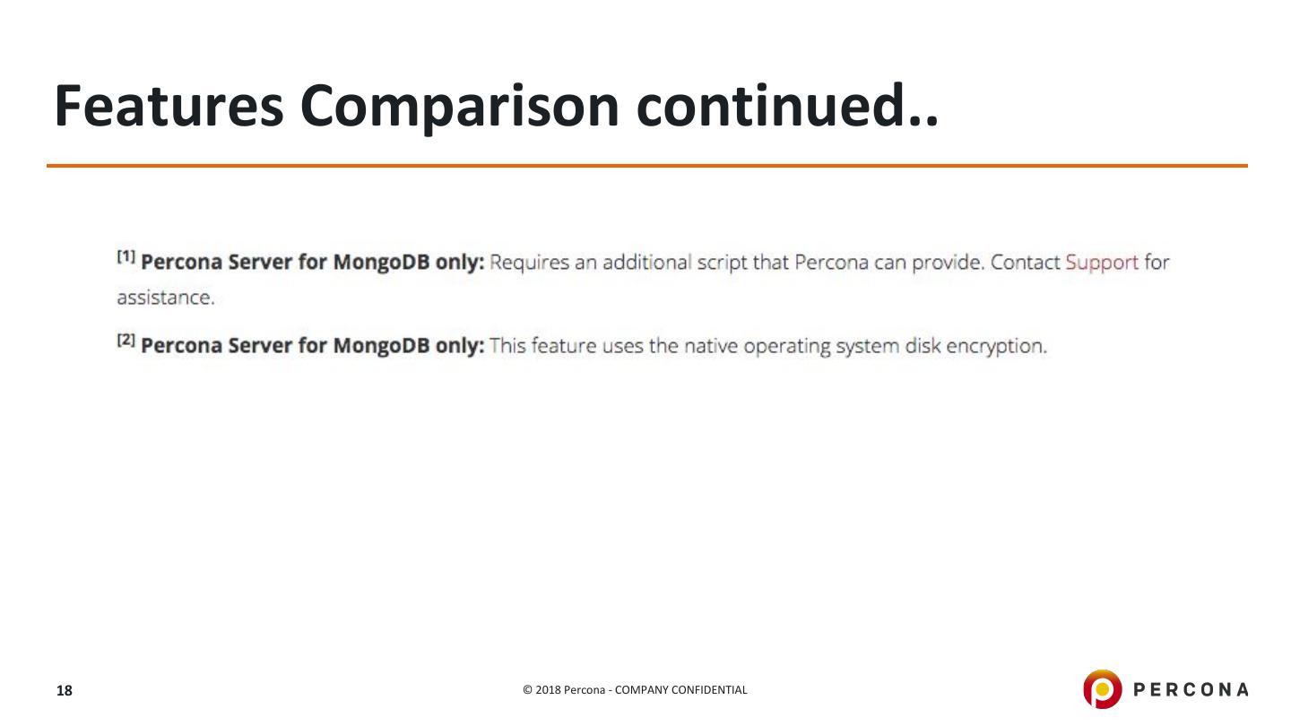 17 .Features Comparison continued.. https://www.percona.com/software/mongo-database/feature-comparison 17 © 2018 Percona - COMPANY CONFIDENTIAL