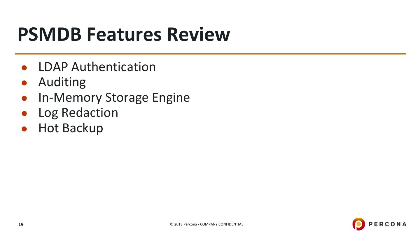 19 .PSMDB Features Review ● LDAP Authentication ● Auditing ● In-Memory Storage Engine ● Log Redaction ● Hot Backup 19 © 2018 Percona - COMPANY CONFIDENTIAL