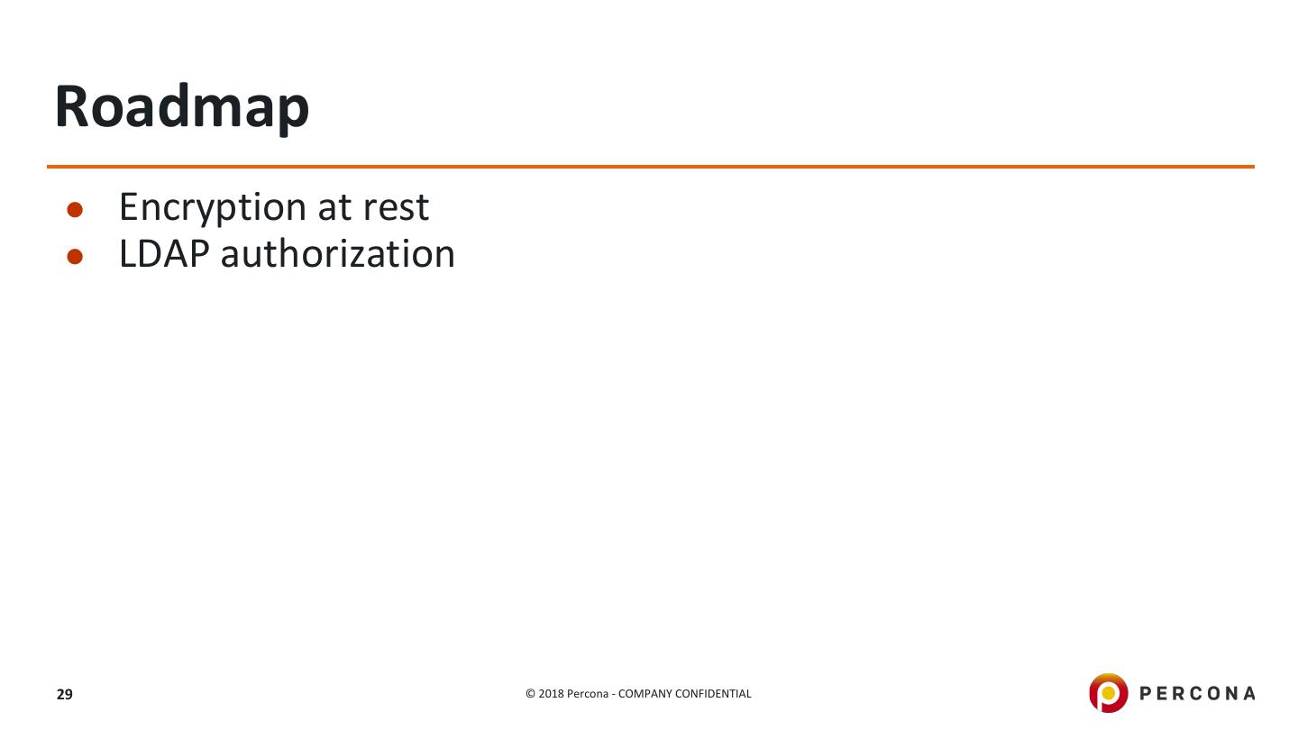 29 .Roadmap ● Encryption at rest ● LDAP authorization 29 © 2018 Percona - COMPANY CONFIDENTIAL