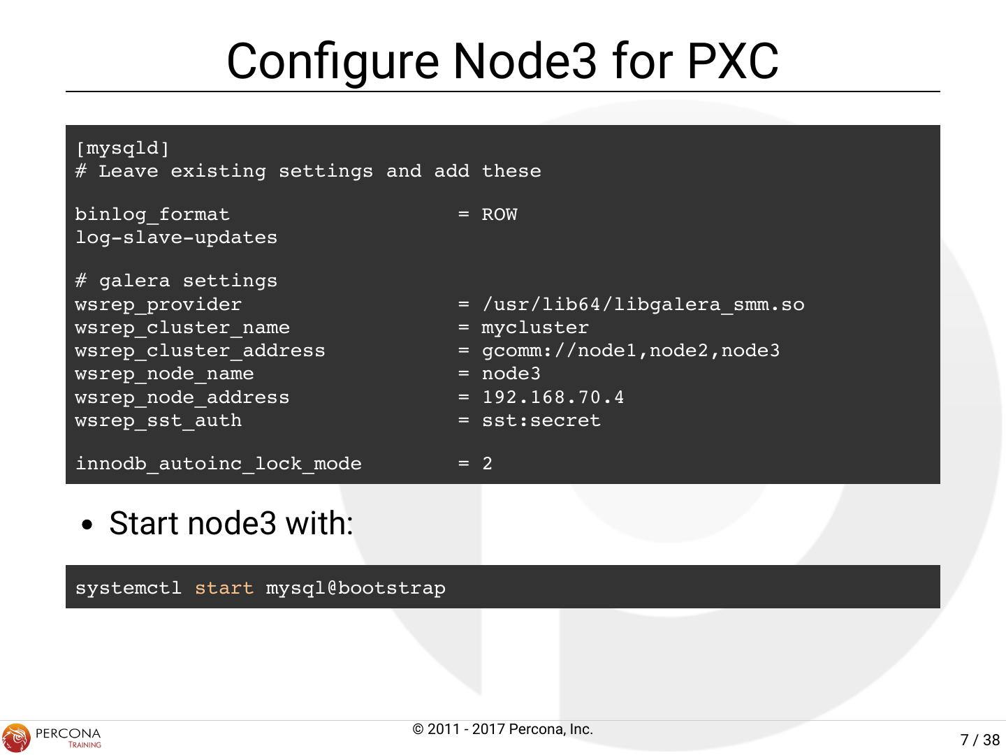 7 . Con gure Node3 for PXC [mysqld] # Leave existing settings and add these binlog_format = ROW log-slave-updates # galera settings wsrep_provider = /usr/lib64/libgalera_smm.so wsrep_cluster_name = mycluster wsrep_cluster_address = gcomm://node1,node2,node3 wsrep_node_name = node3 wsrep_node_address = 192.168.70.4 wsrep_sst_auth = sst:secret innodb_autoinc_lock_mode = 2 Start node3 with: systemctl start mysql@bootstrap © 2011 - 2017 Percona, Inc. 7 / 38