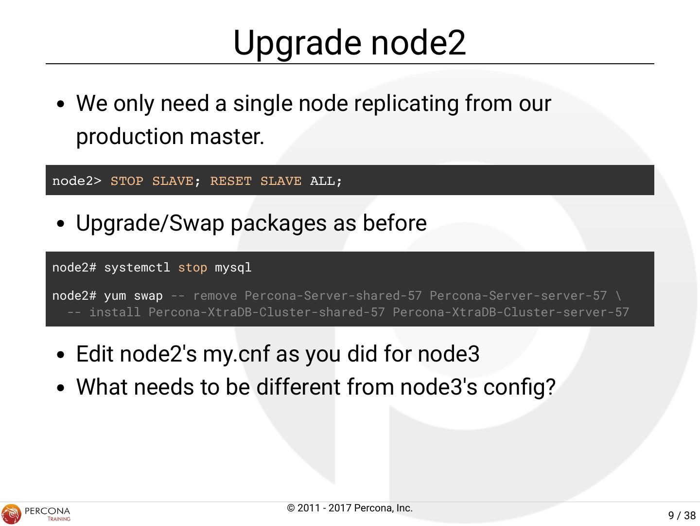 9 . Upgrade node2 We only need a single node replicating from our production master. node2> STOP SLAVE; RESET SLAVE ALL; Upgrade/Swap packages as before node2# systemctl stop mysql node2# yum swap -- remove Percona-Server-shared-57 Percona-Server-server-57 \ -- install Percona-XtraDB-Cluster-shared-57 Percona-XtraDB-Cluster-server-57 Edit node2's my.cnf as you did for node3 What needs to be different from node3's con g? © 2011 - 2017 Percona, Inc. 9 / 38