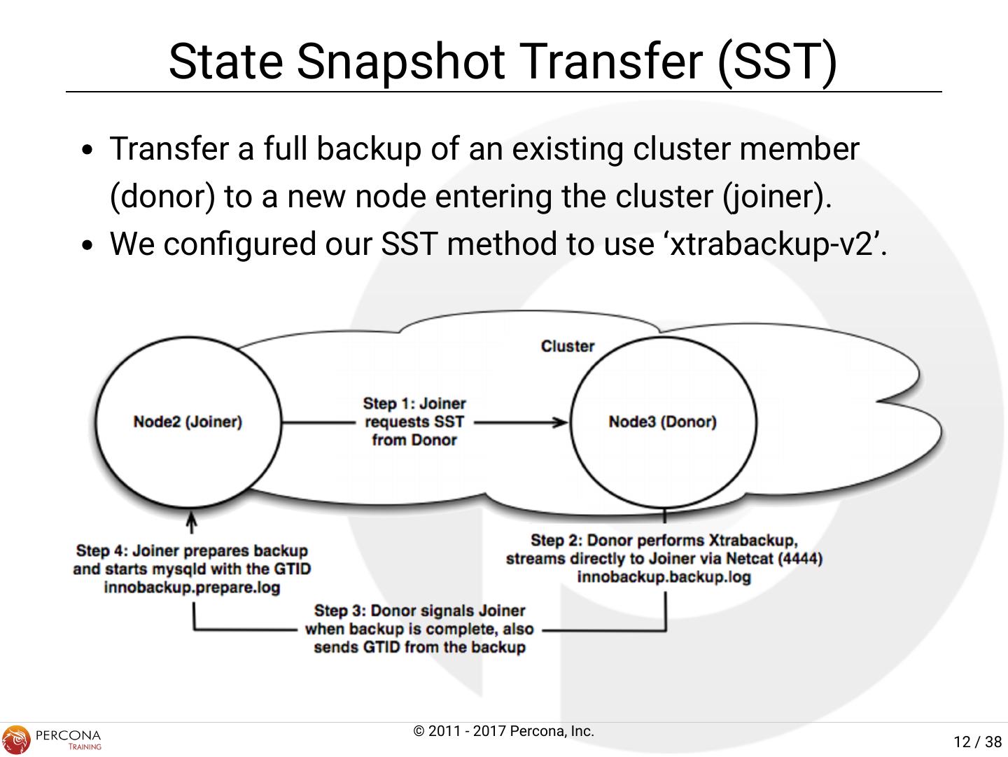 12 . State Snapshot Transfer (SST) Transfer a full backup of an existing cluster member (donor) to a new node entering the cluster (joiner). We con gured our SST method to use ‘xtrabackup-v2’. © 2011 - 2017 Percona, Inc. 12 / 38