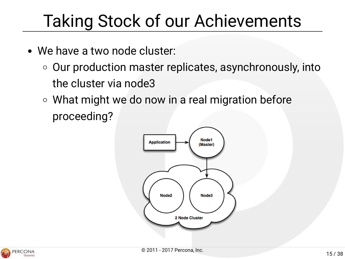 15 . Taking Stock of our Achievements We have a two node cluster: Our production master replicates, asynchronously, into the cluster via node3 What might we do now in a real migration before proceeding? © 2011 - 2017 Percona, Inc. 15 / 38