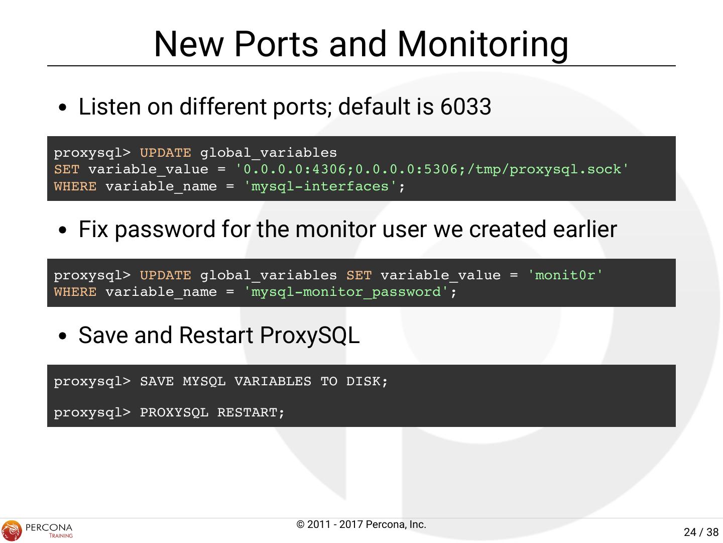 24 . New Ports and Monitoring Listen on different ports; default is 6033 proxysql> UPDATE global_variables SET variable_value = '0.0.0.0:4306;0.0.0.0:5306;/tmp/proxysql.sock' WHERE variable_name = 'mysql-interfaces'; Fix password for the monitor user we created earlier proxysql> UPDATE global_variables SET variable_value = 'monit0r' WHERE variable_name = 'mysql-monitor_password'; Save and Restart ProxySQL proxysql> SAVE MYSQL VARIABLES TO DISK; proxysql> PROXYSQL RESTART; © 2011 - 2017 Percona, Inc. 24 / 38