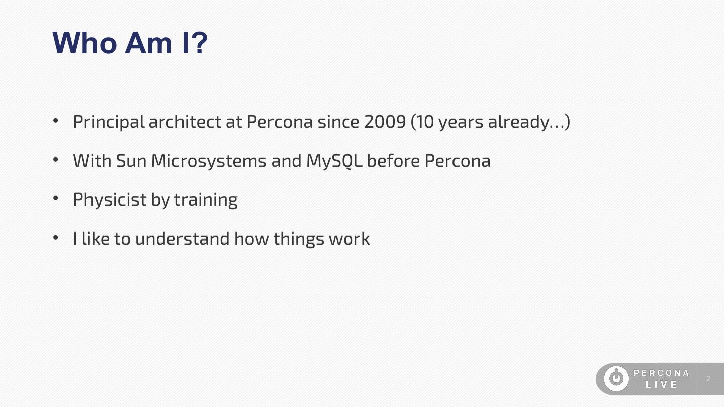 2 .Who Am I? • Principal architect at Percona since 2009 (10 years already…) • With Sun Microsystems and MySQL before Percona • Physicist by training • I like to understand how things work 2