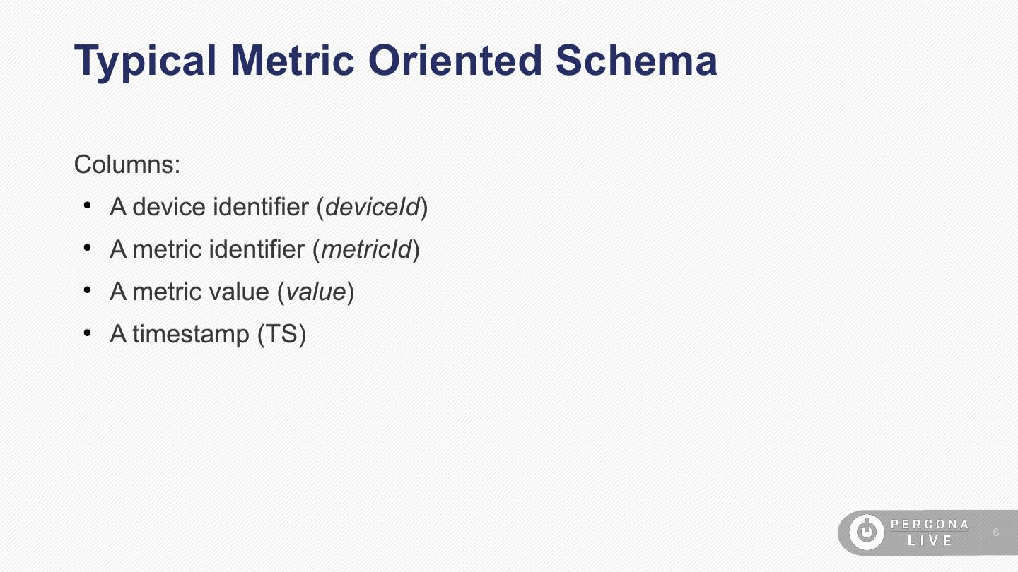 6 .Typical Metric Oriented Schema Columns: ● A device identifier (deviceId) ● A metric identifier (metricId) ● A metric value (value) ● A timestamp (TS) 6