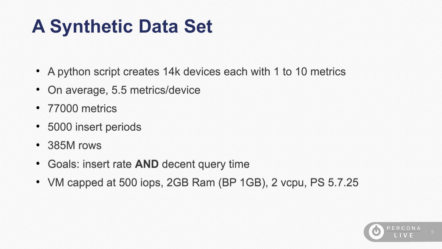 9 .A Synthetic Data Set ● A python script creates 14k devices each with 1 to 10 metrics ● On average, 5.5 metrics/device ● 77000 metrics ● 5000 insert periods ● 385M rows ● Goals: insert rate AND decent query time ● VM capped at 500 iops, 2GB Ram (BP 1GB), 2 vcpu, PS 5.7.25 9