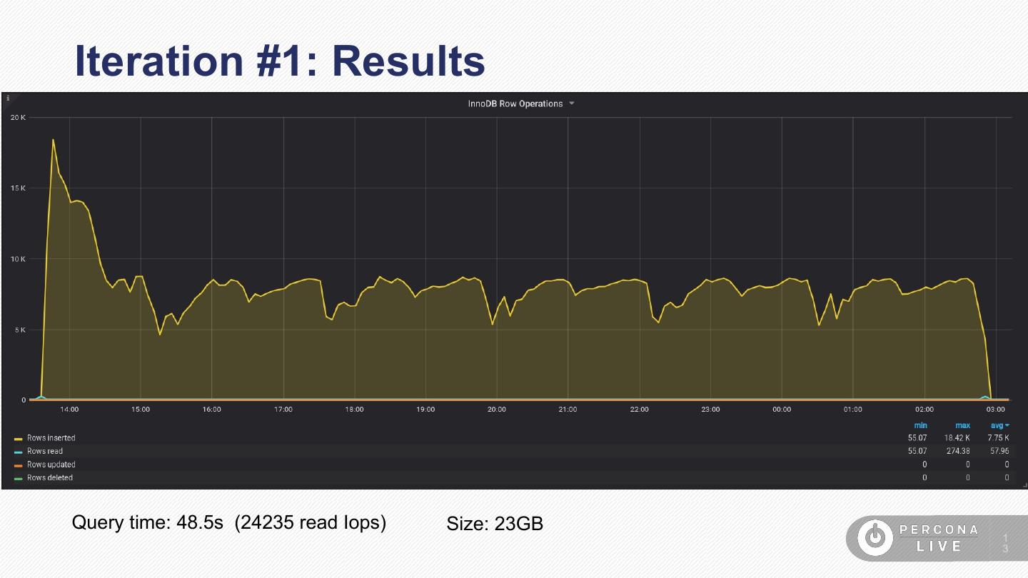 13 .Iteration #1: Results Query time: 48.5s (24235 read Iops) Size: 23GB 1 3