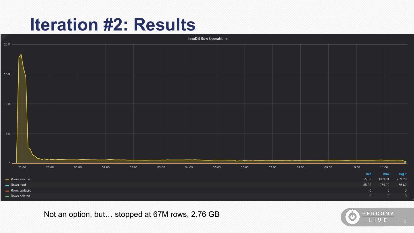 15 .Iteration #2: Results Not an option, but… stopped at 67M rows, 2.76 GB 1 5