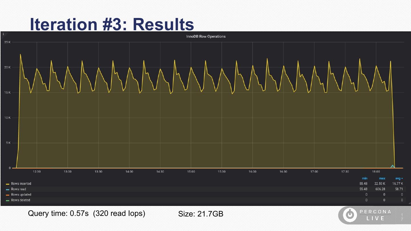 17 .Iteration #3: Results Query time: 0.57s (320 read Iops) Size: 21.7GB 1 7