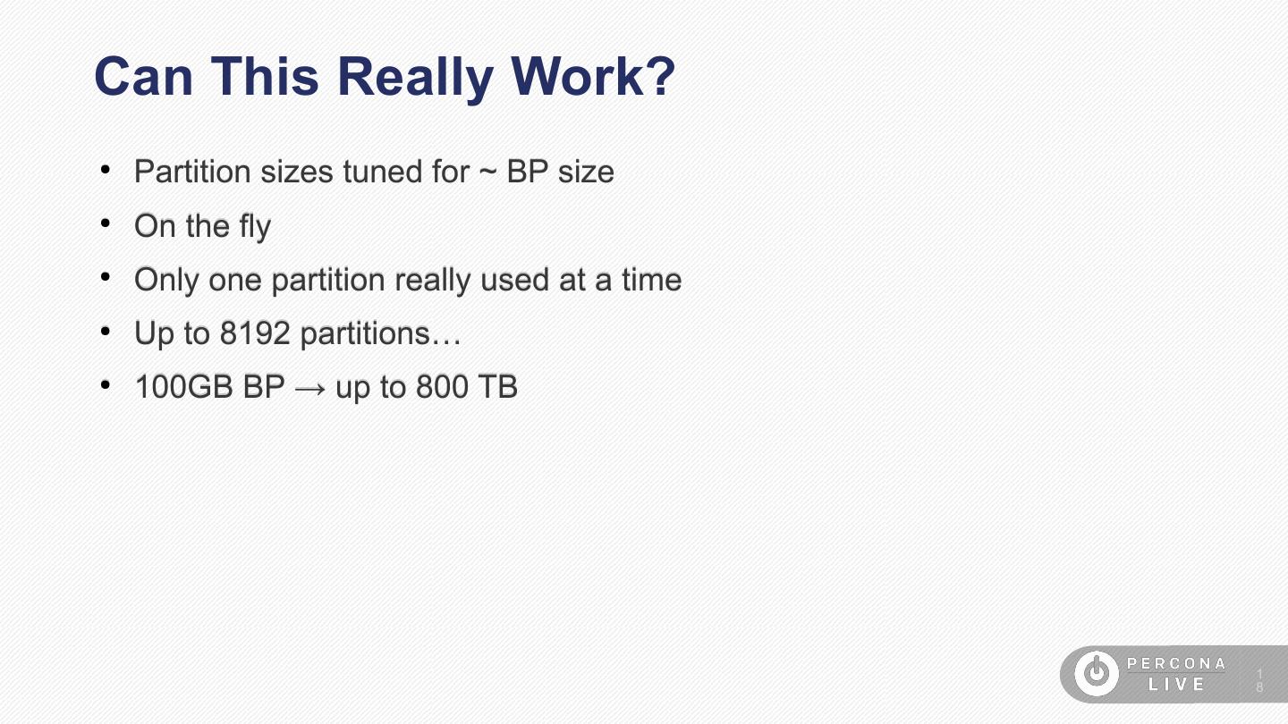 18 .Can This Really Work? ● Partition sizes tuned for ~ BP size ● On the fly ● Only one partition really used at a time ● Up to 8192 partitions… ● 100GB BP → up to 800 TB 1 8