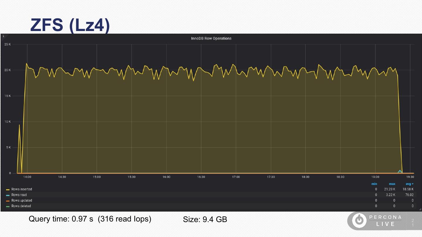 21 .ZFS (Lz4) Query time: 0.97 s (316 read Iops) Size: 9.4 GB 2 1