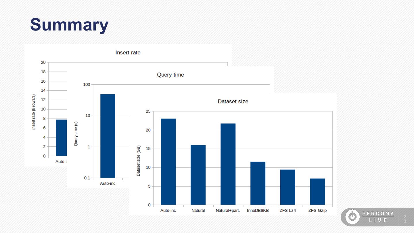 16 . Iteration #3: Natural PK + Partitions CREATE TABLE `CollectorMetrics` ( `deviceId` int(10) unsigned NOT NULL, `metricId` smallint(5) unsigned NOT NULL, `Value` float NOT NULL, `TS` int(10) unsigned NOT NULL, PRIMARY KEY (`deviceId`,`metricId`,`TS`) ) ENGINE=InnoDB DEFAULT CHARSET=latin1 /*!50100 PARTITION BY RANGE (TS) (PARTITION p1555691218 VALUES LESS THAN (1555691218) ENGINE = InnoDB, PARTITION p1555692118 VALUES LESS THAN (1555692118) ENGINE = InnoDB, PARTITION p1555693018 VALUES LESS THAN (1555693018) ENGINE = InnoDB, … PARTITION p1555719118 VALUES LESS THAN (1555719118) ENGINE = InnoDB, PARTITION pMax VALUES LESS THAN (4294967295) ENGINE = InnoDB) */ 32 partitions 1 6