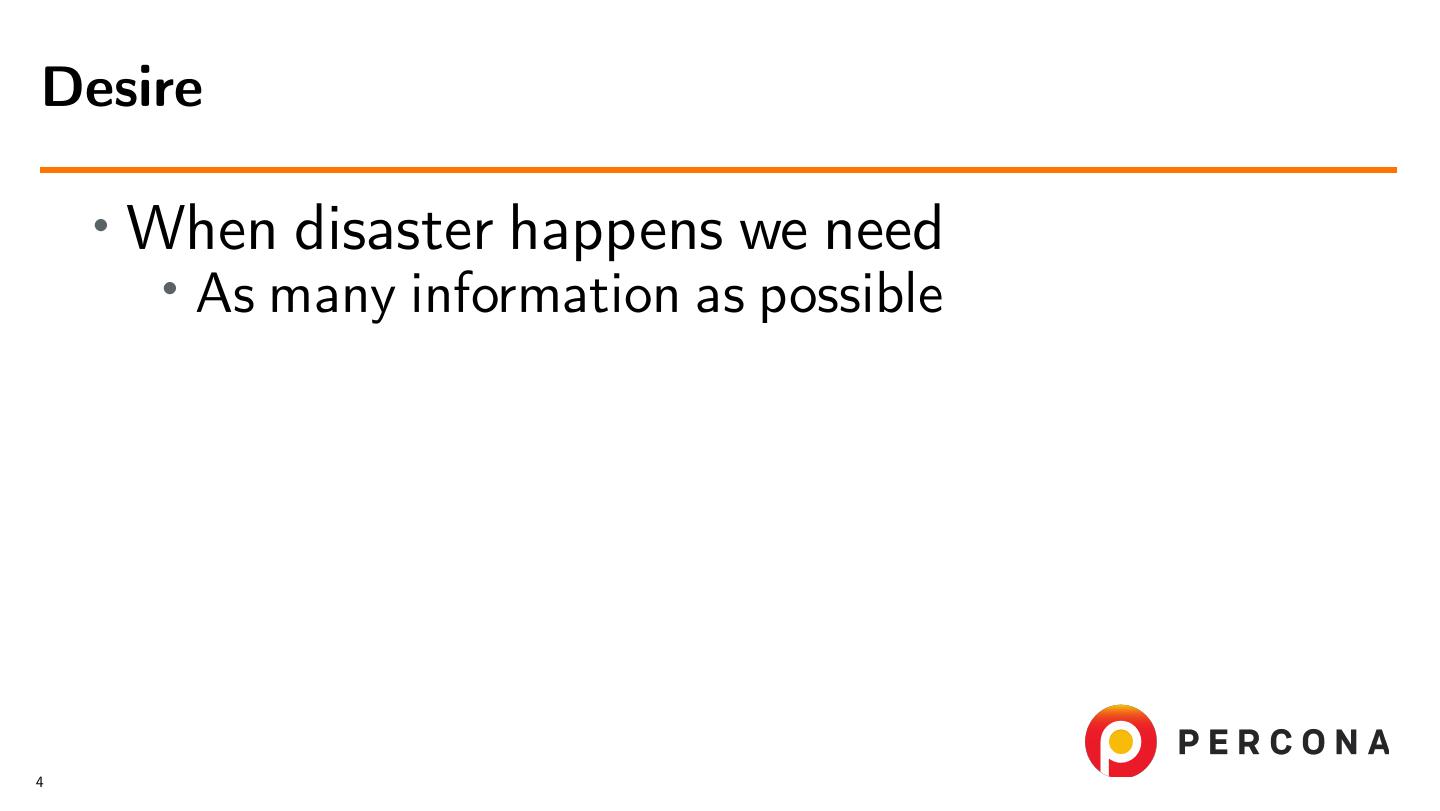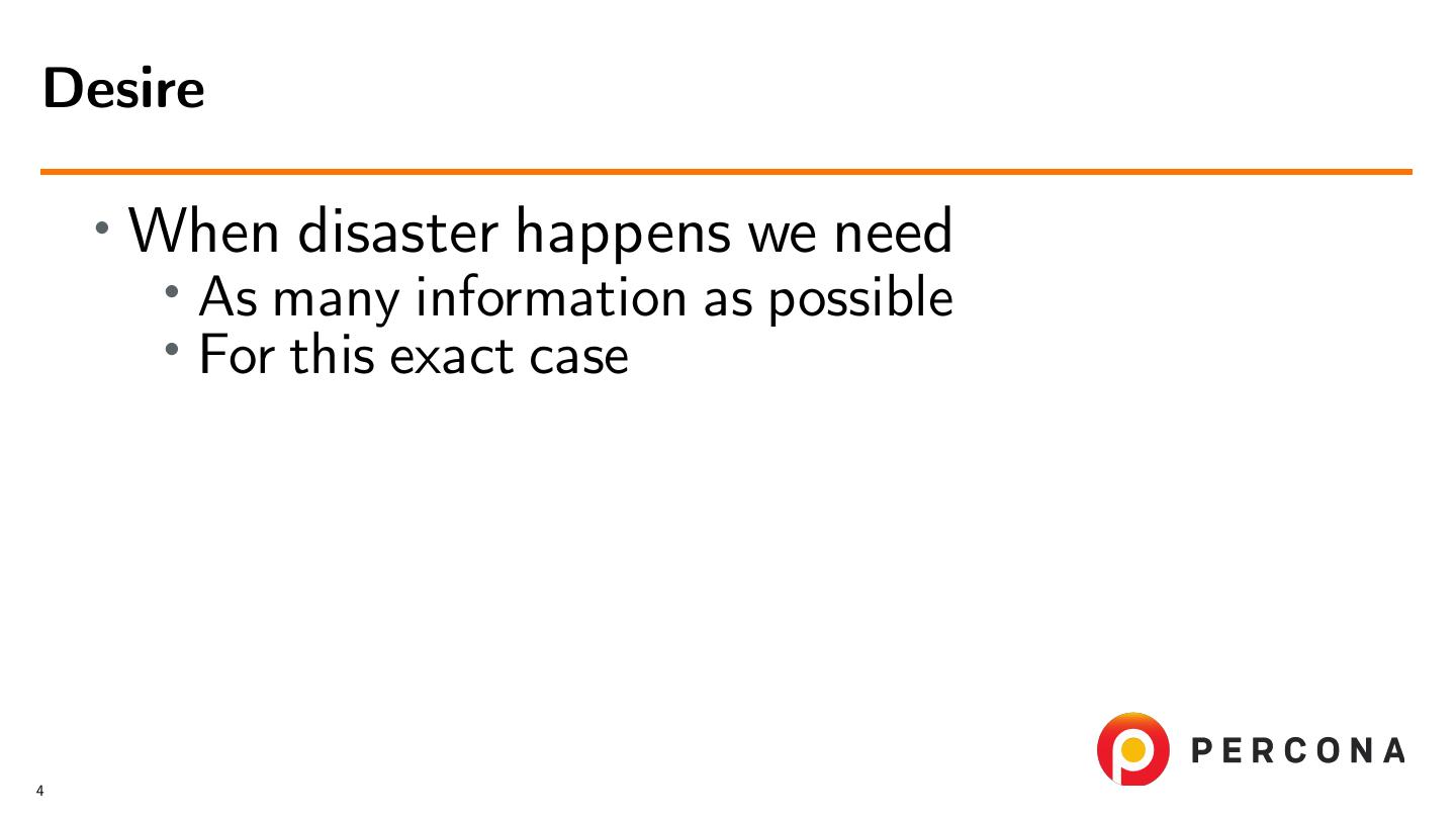 7 .Desire • When disaster happens we need • As many information as possible • For this exact case • Any slow down is not acceptable! 4