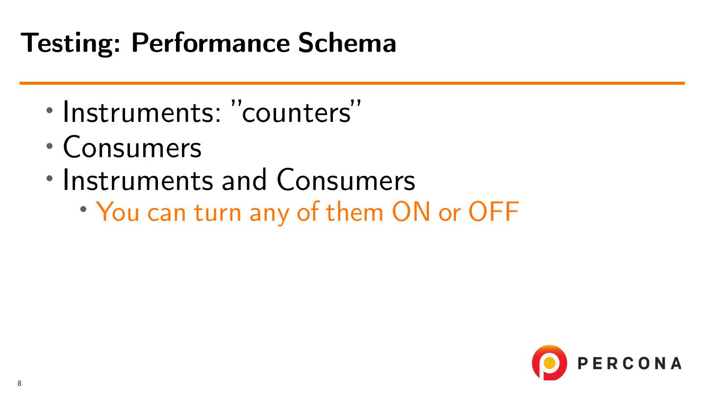 14 .Testing: Performance Schema • Instruments: ”counters” • Consumers • Instruments and Consumers • You can turn any of them ON or OFF 8