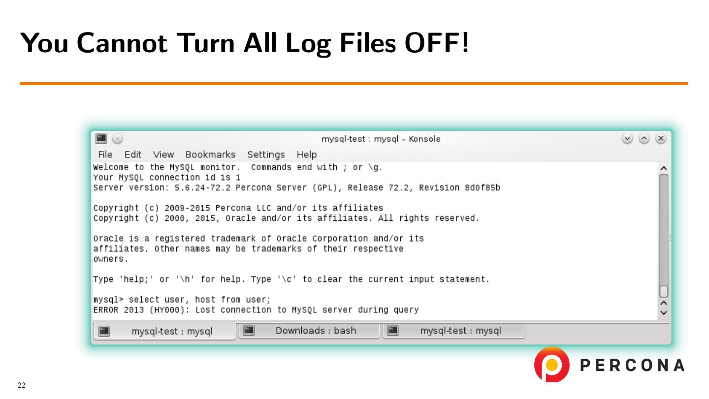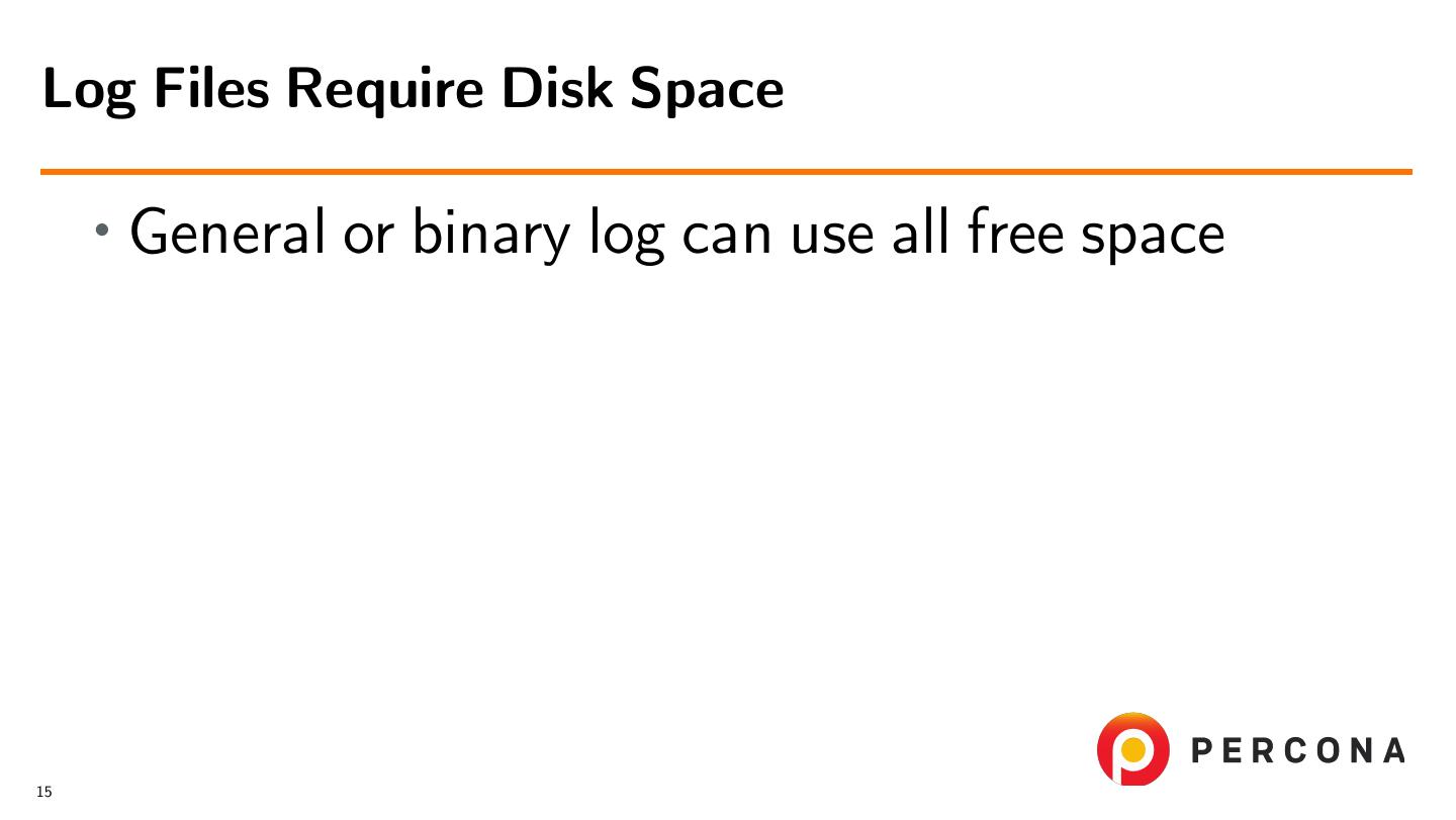 22 .Log Files Require Disk Space • General or binary log can use all free space • Imagine write load 40GB/hour? 15