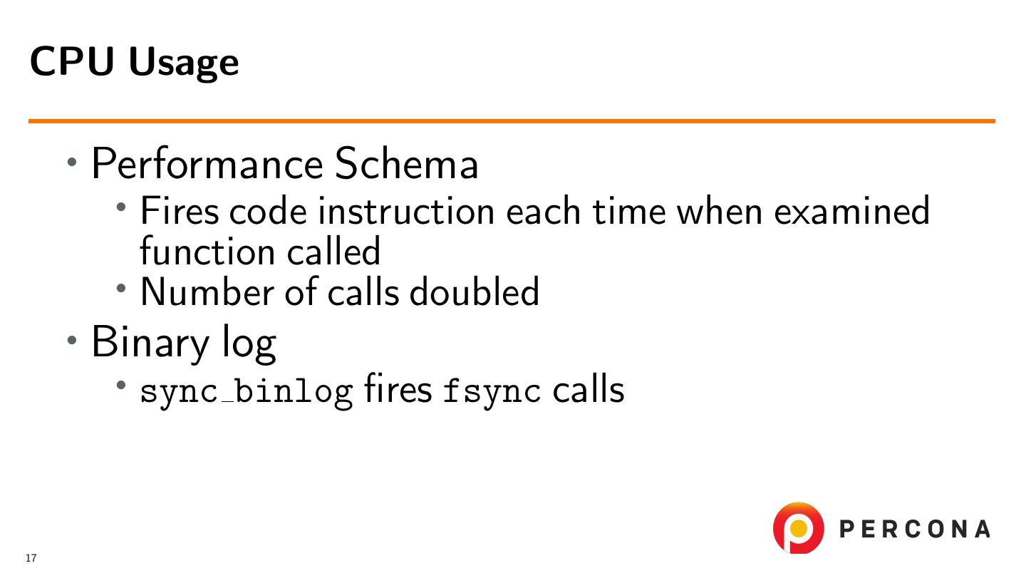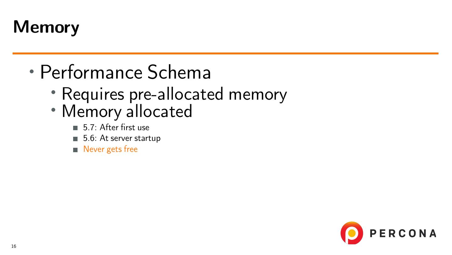 25 .Memory • Performance Schema • Requires pre-allocated memory • Memory allocated 5.7: After first use 5.6: At server startup Never gets free 16