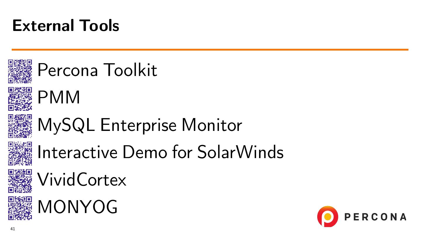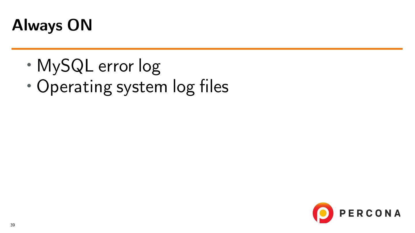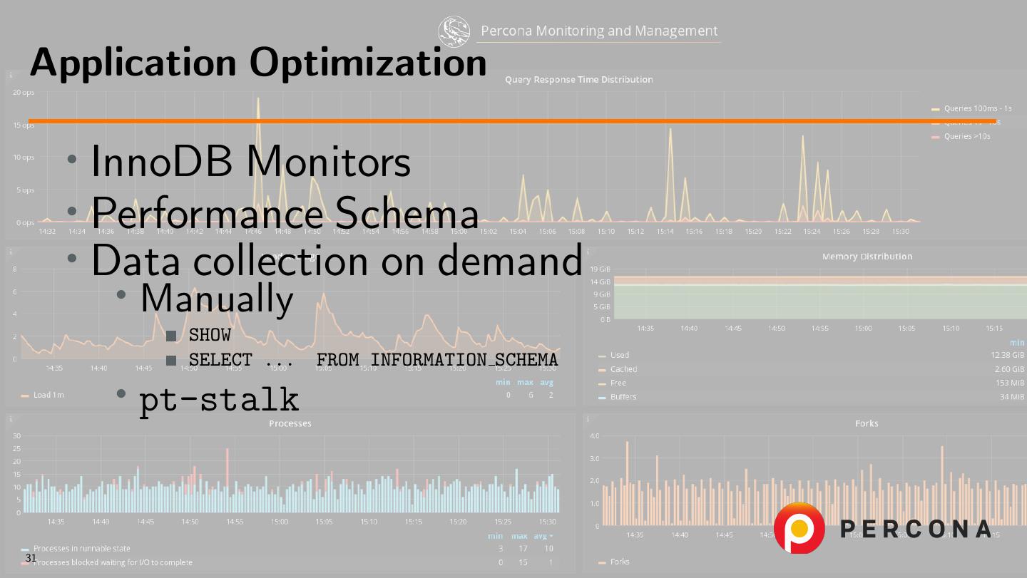 在MySQL疑难解答网络研讨会系列中,我介绍了许多监控和日志记录工具,例如: