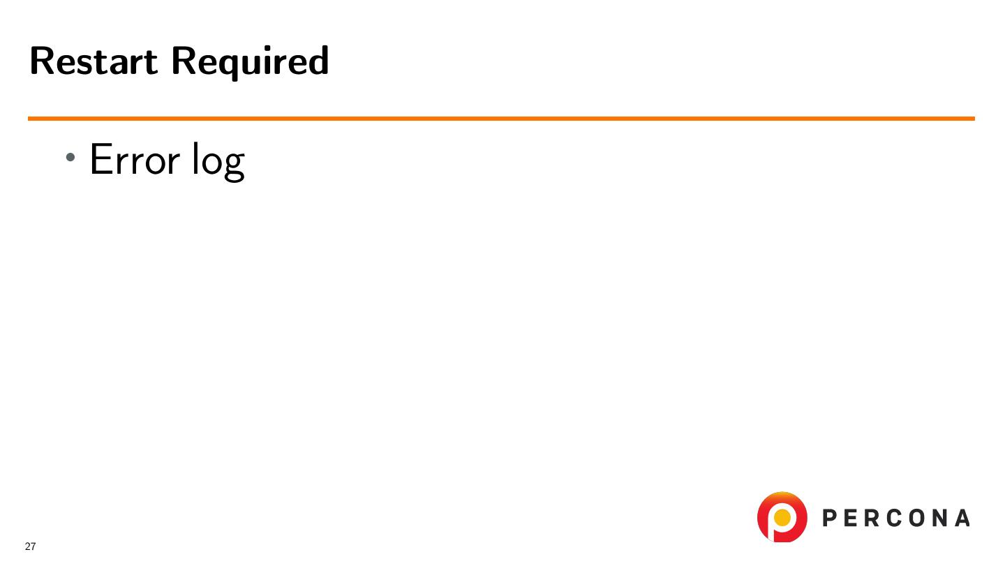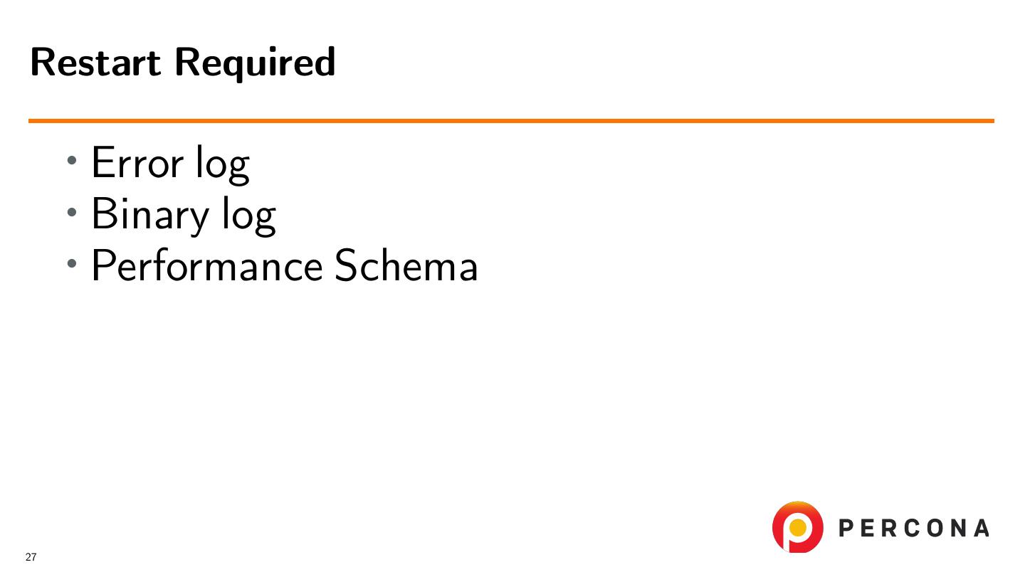 26 .Memory • Performance Schema • Requires pre-allocated memory • Memory allocated 5.7: After first use 5.6: At server startup Never gets free • Size of history tables is limited 16