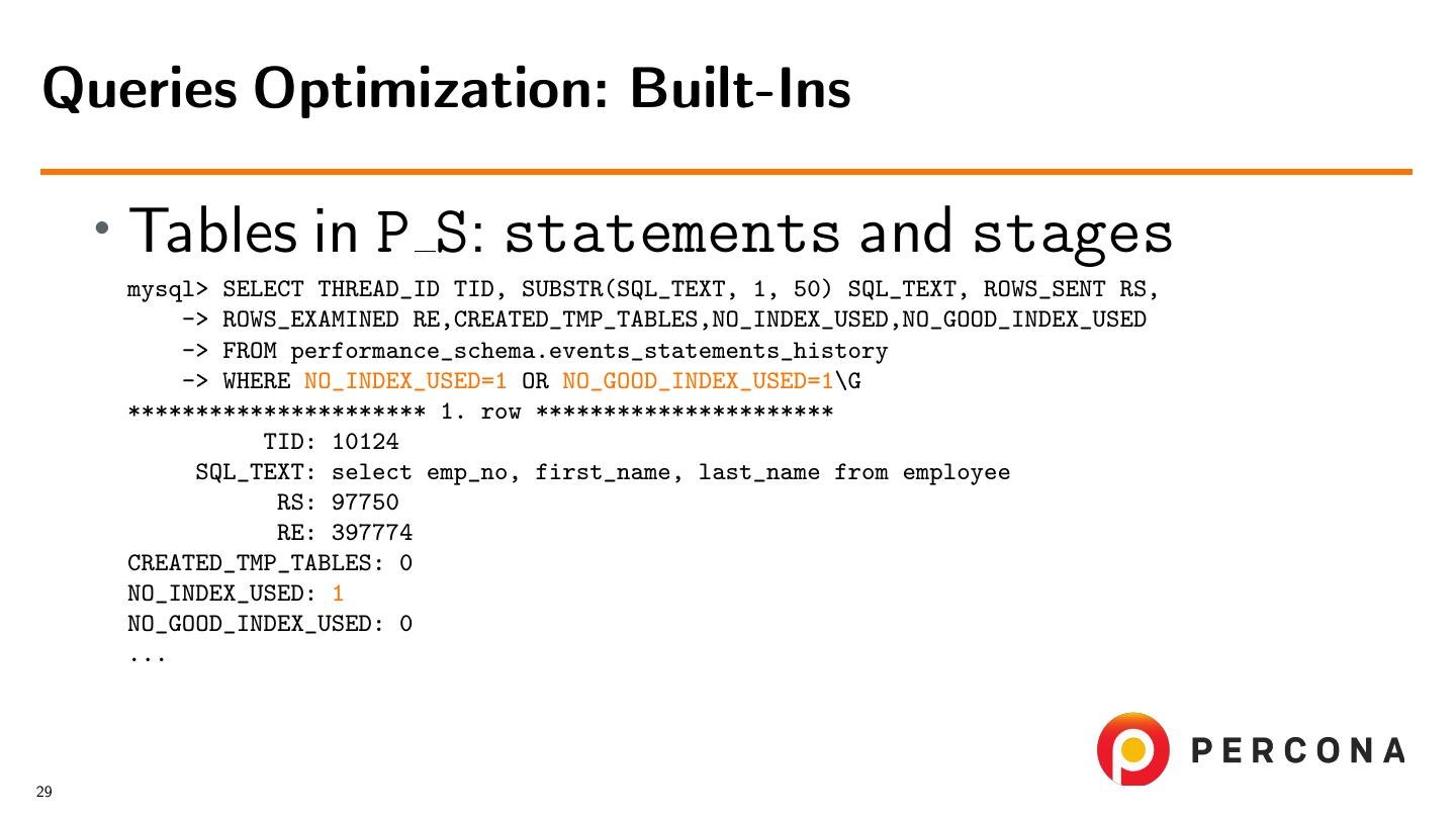 28 .Memory • Performance Schema • Information Schema • Some queries require too much memory • MySQL 8.0 re-designed tables No temporary tables for each query Index support MySQL 8.0.0 Release Notes 16