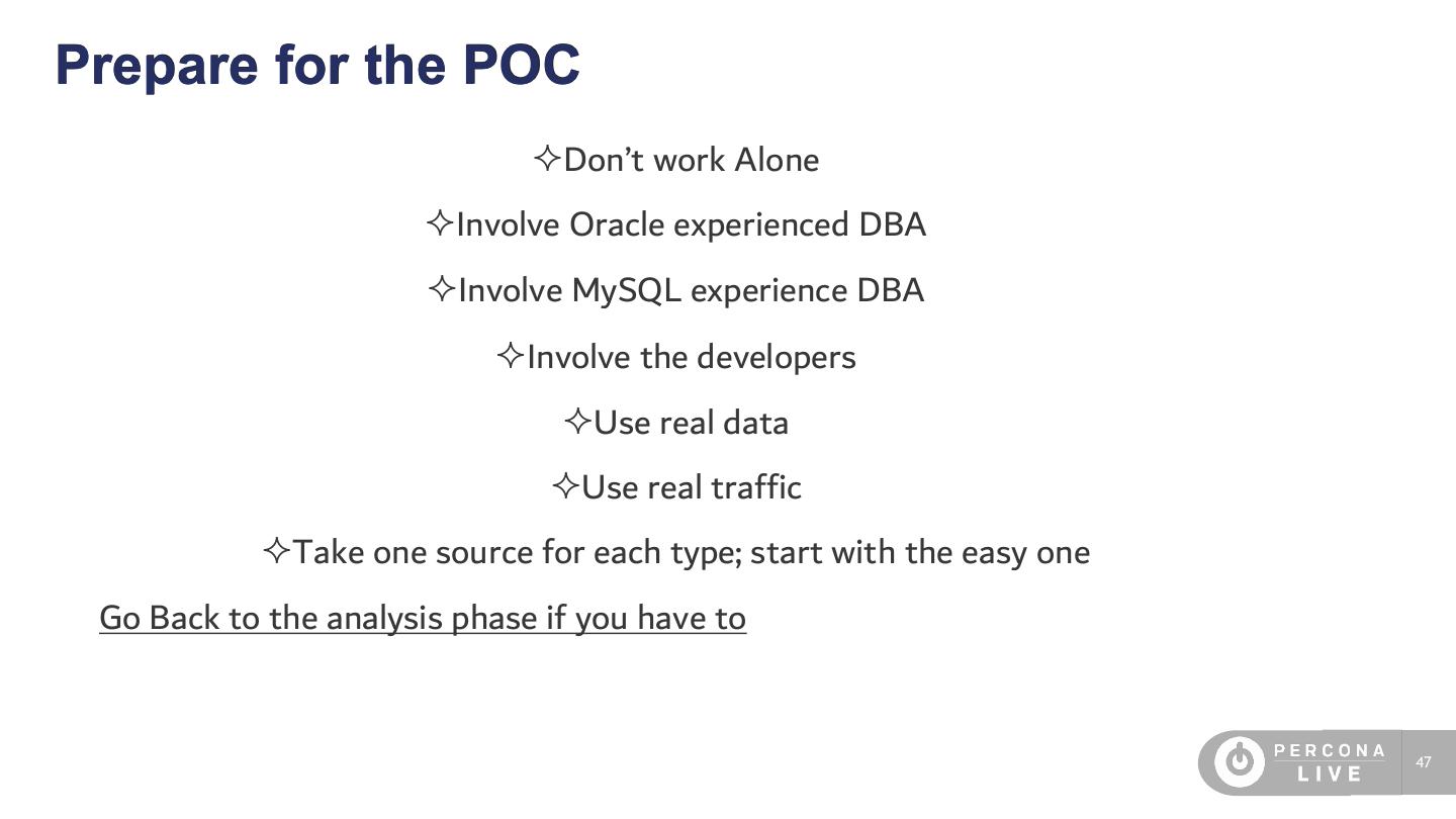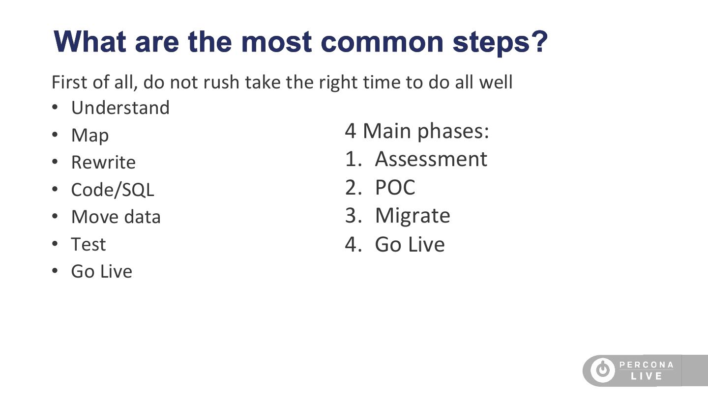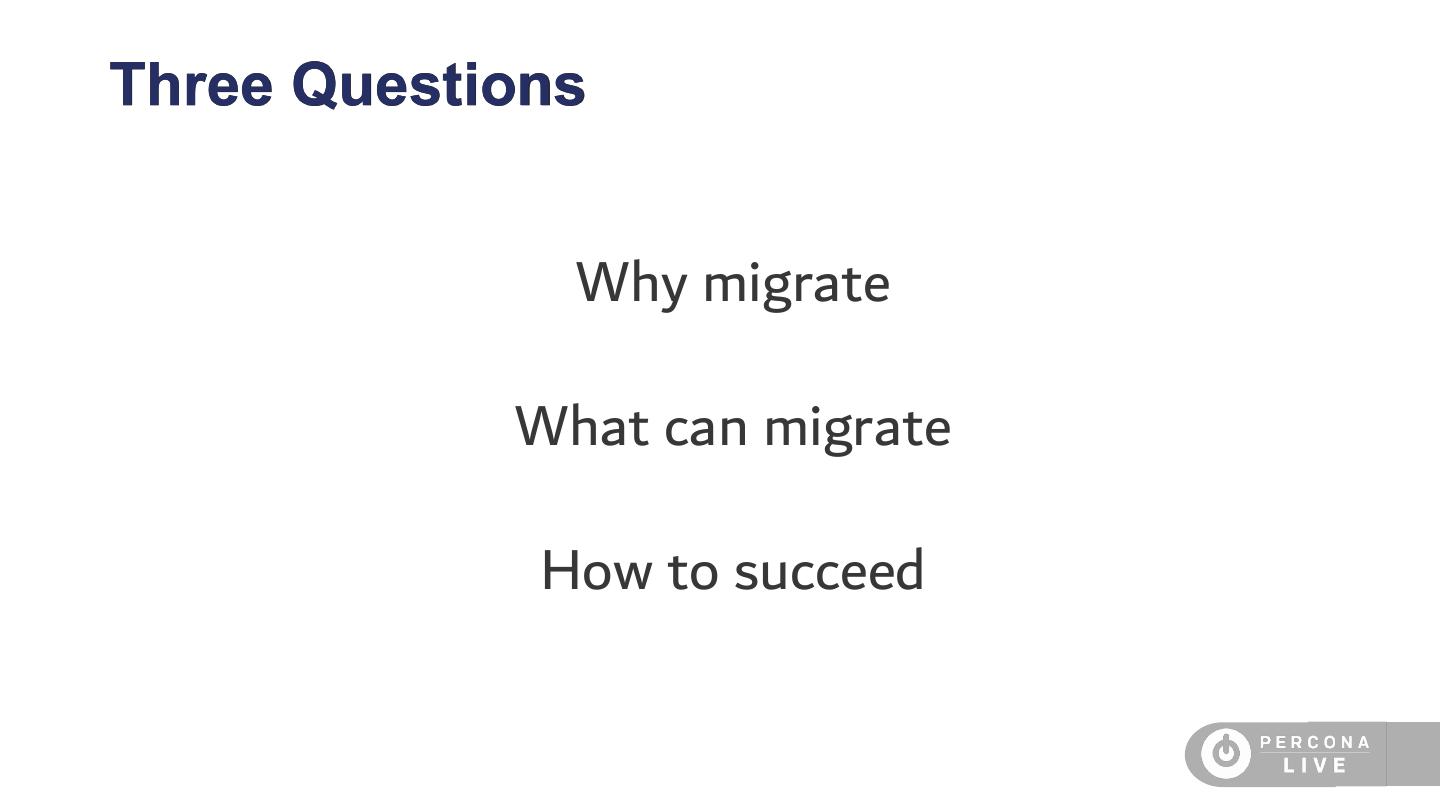 本演示的范围是说明我们在Percona如何执行该评估,以及帮助客户成功决定迁移方式和迁移时间的方法。