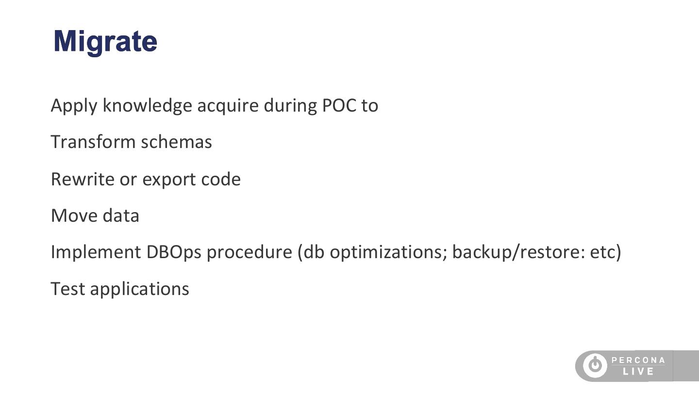 15 .Migrate Apply knowledge acquire during POC to Transform schemas Rewrite or export code Move data Implement DBOps procedure (db optimizations; backup/restore: etc) Test applications