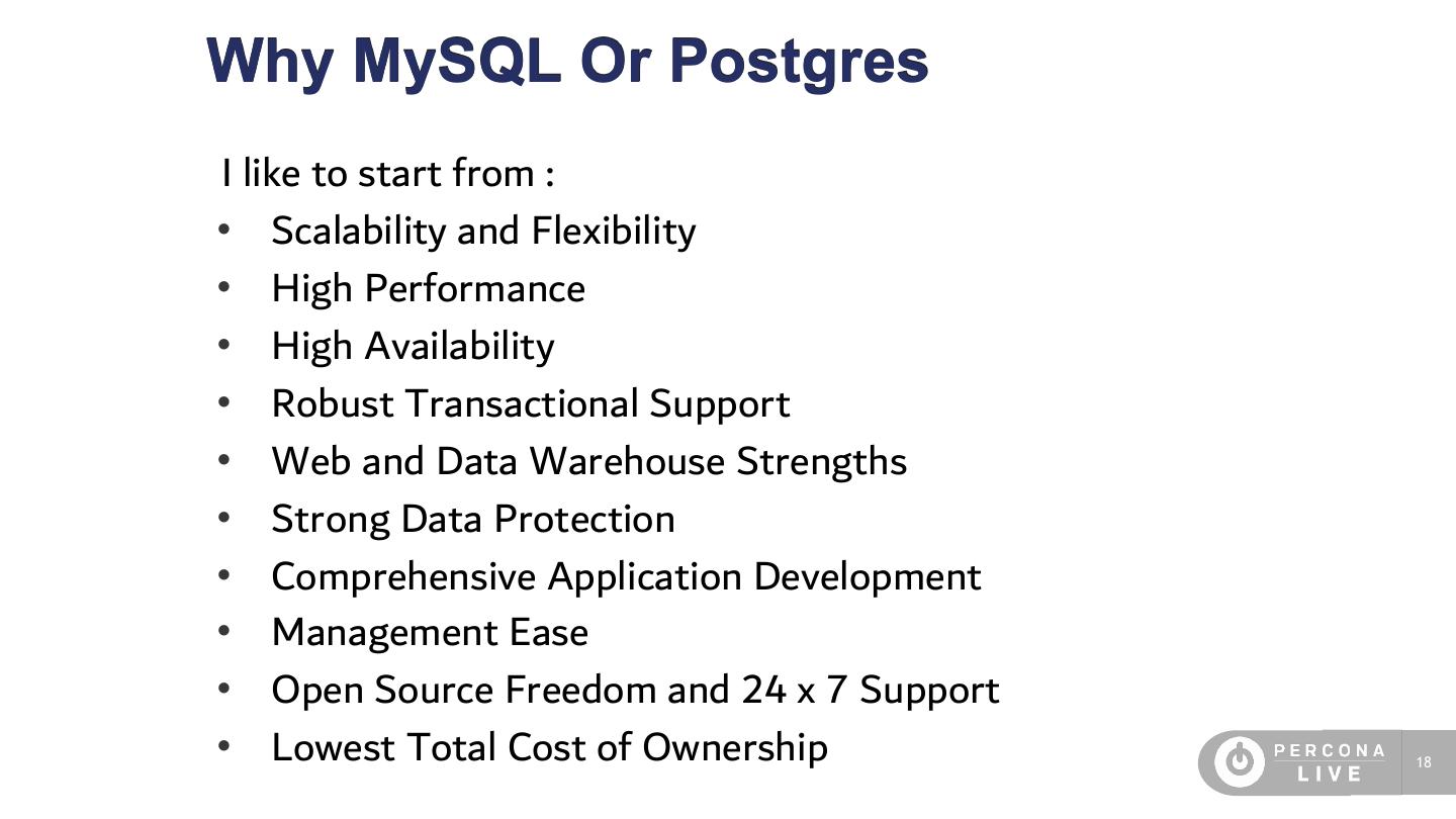 18 .Why MySQL Or Postgres I like to start from : • Scalability and Flexibility • High Performance • High Availability • Robust Transactional Support • Web and Data Warehouse Strengths • Strong Data Protection • Comprehensive Application Development • Management Ease • Open Source Freedom and 24 x 7 Support • Lowest Total Cost of Ownership 18