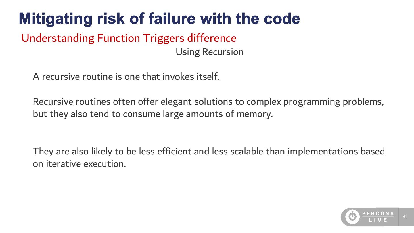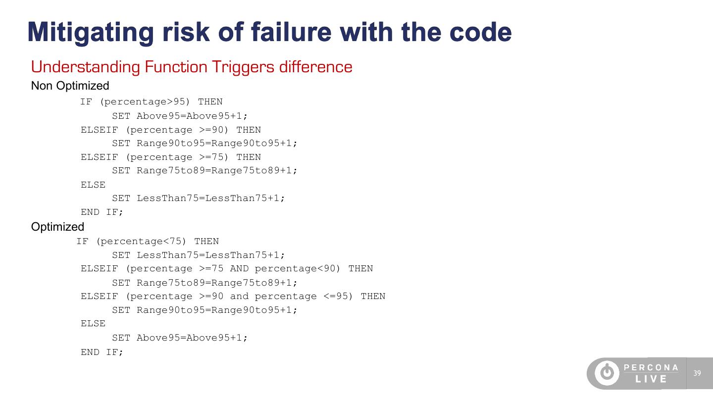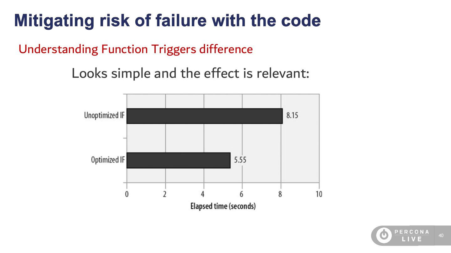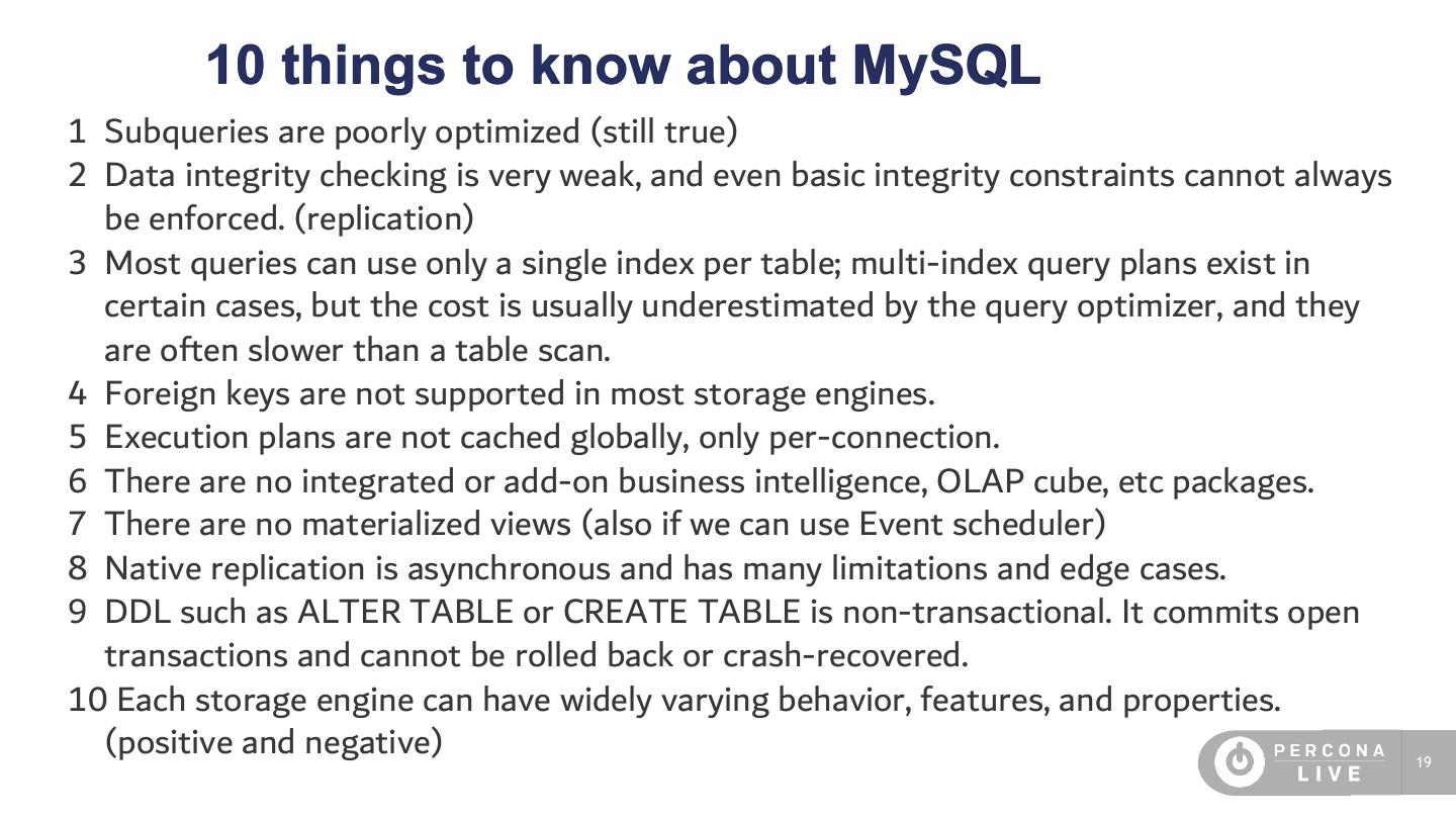 19 . 10 things to know about MySQL 1 Subqueries are poorly optimized (still true) 2 Data integrity checking is very weak, and even basic integrity constraints cannot always be enforced. (replication) 3 Most queries can use only a single index per table; multi-index query plans exist in certain cases, but the cost is usually underestimated by the query optimizer, and they are often slower than a table scan. 4 Foreign keys are not supported in most storage engines. 5 Execution plans are not cached globally, only per-connection. 6 There are no integrated or add-on business intelligence, OLAP cube, etc packages. 7 There are no materialized views (also if we can use Event scheduler) 8 Native replication is asynchronous and has many limitations and edge cases. 9 DDL such as ALTER TABLE or CREATE TABLE is non-transactional. It commits open transactions and cannot be rolled back or crash-recovered. 10 Each storage engine can have widely varying behavior, features, and properties. (positive and negative) 19