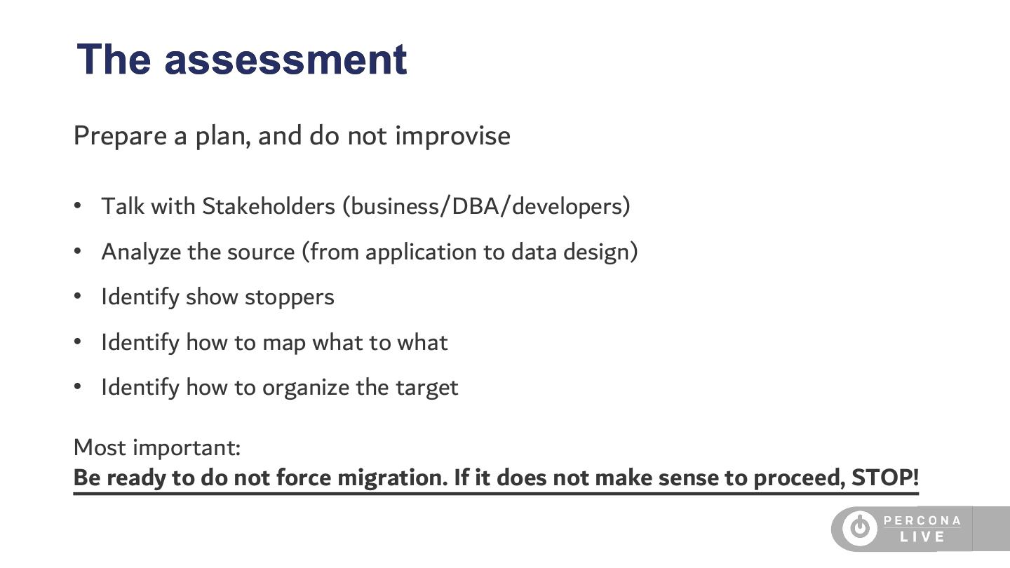 23 .The assessment Prepare a plan, and do not improvise • Talk with Stakeholders (business/DBA/developers) • Analyze the source (from application to data design) • Identify show stoppers • Identify how to map what to what • Identify how to organize the target Most important: Be ready to do not force migration. If it does not make sense to proceed, STOP!