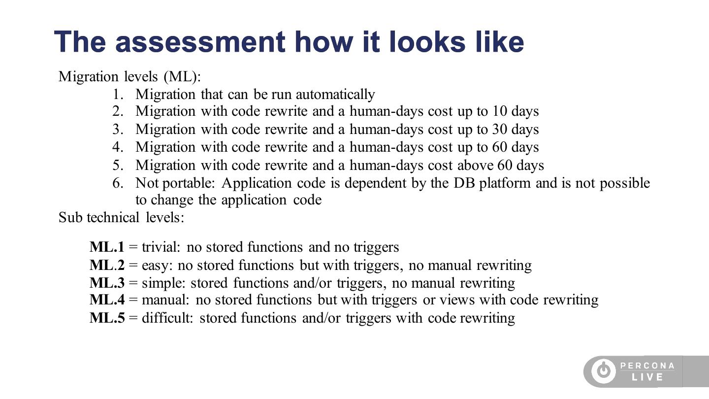 26 .The assessment how it looks like Migration levels (ML): 1. Migration that can be run automatically 2. Migration with code rewrite and a human-days cost up to 10 days 3. Migration with code rewrite and a human-days cost up to 30 days 4. Migration with code rewrite and a human-days cost up to 60 days 5. Migration with code rewrite and a human-days cost above 60 days 6. Not portable: Application code is dependent by the DB platform and is not possible to change the application code Sub technical levels: ML.1 = trivial: no stored functions and no triggers ML.2 = easy: no stored functions but with triggers, no manual rewriting ML.3 = simple: stored functions and/or triggers, no manual rewriting ML.4 = manual: no stored functions but with triggers or views with code rewriting ML.5 = difficult: stored functions and/or triggers with code rewriting