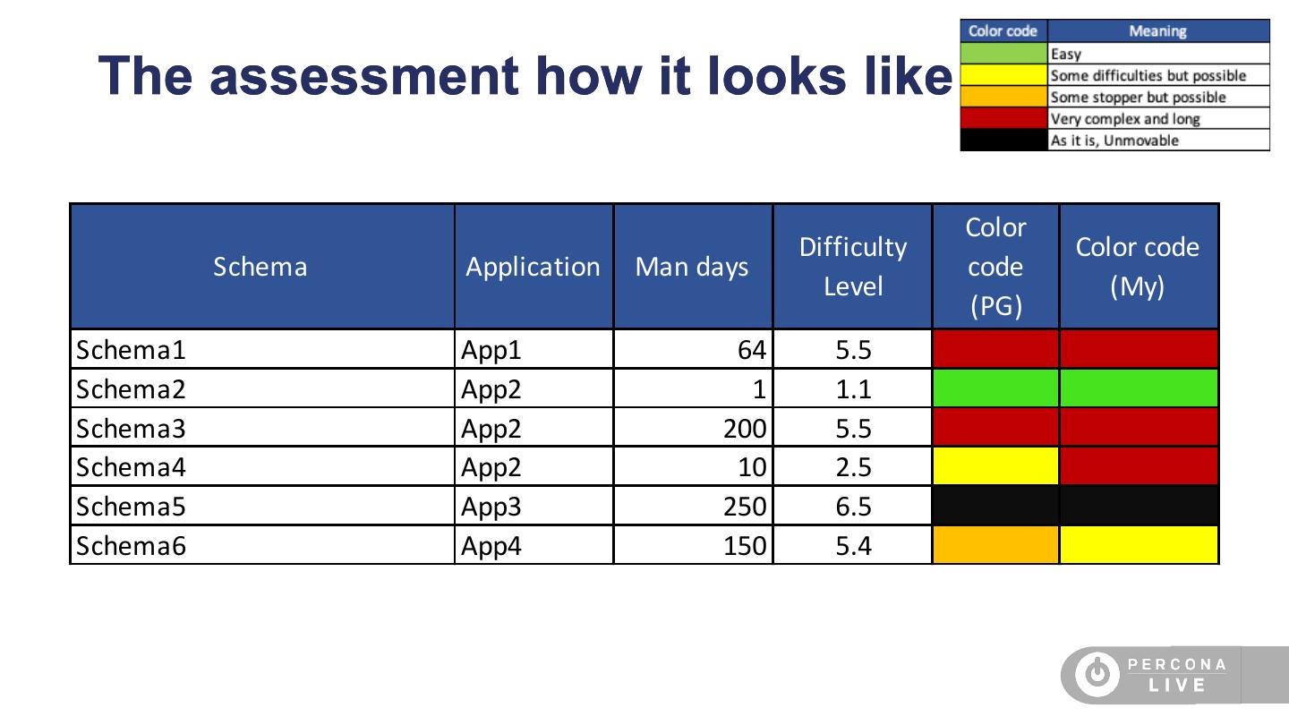 27 .The assessment how it looks like Man days Hestimated Difficulty Color Schema Application Man days per schema instances Level code type ABC Drupal 2.0 1 2 1-1 DEF wordpres 1.0 1 1 1-1 GHI My Java app 1.5 1 1.5 1-1 LMN Sales App 2.0 1 2 1-1 OPQR Booking 2.0 1 2 1-1 STV Insurances 5.0 12 30 3-3 Z1 Tikets 12 10 48 4-5(*)(**) AA1 Advertise 2.00 19 30 1-1* AA2 Network App 2.0 200 80 1-1* *Per instance **Schema may take short time, but Store procedure require rewrite