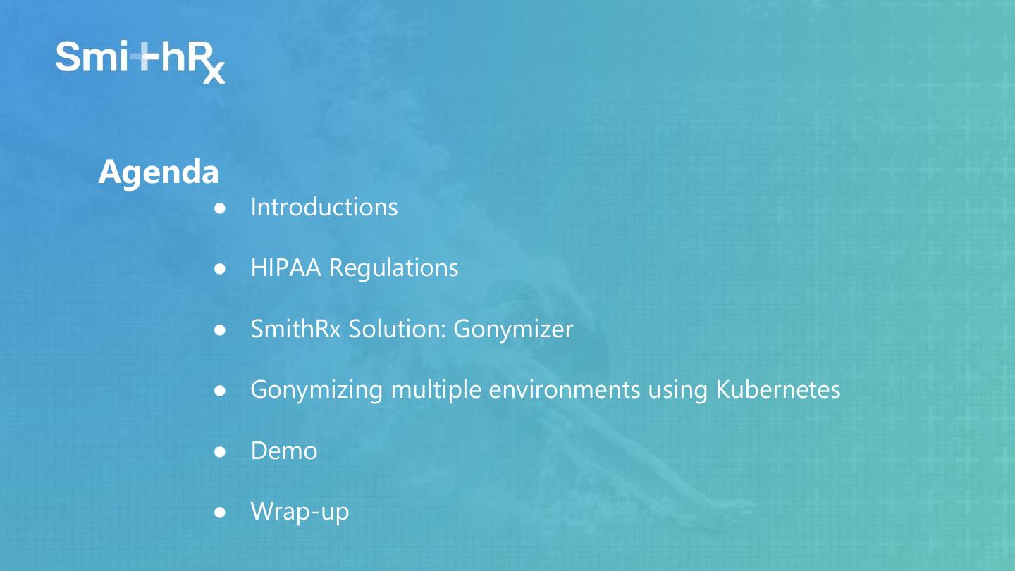2 .Agenda ● Introductions ● HIPAA Regulations ● SmithRx Solution: Gonymizer ● Gonymizing multiple environments using Kubernetes ● Demo ● Wrap-up