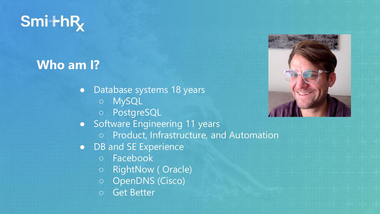 3 .Who am I? ● Database systems 18 years ○ MySQL ○ PostgreSQL ● Software Engineering 11 years ○ Product, Infrastructure, and Automation ● DB and SE Experience ○ Facebook ○ RightNow ( Oracle) ○ OpenDNS (Cisco) ○ Get Better