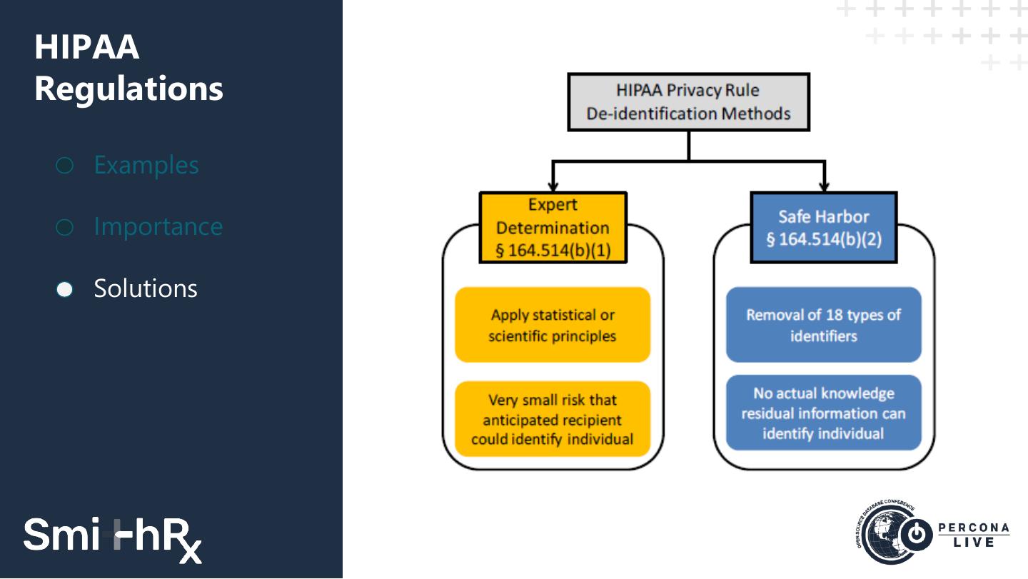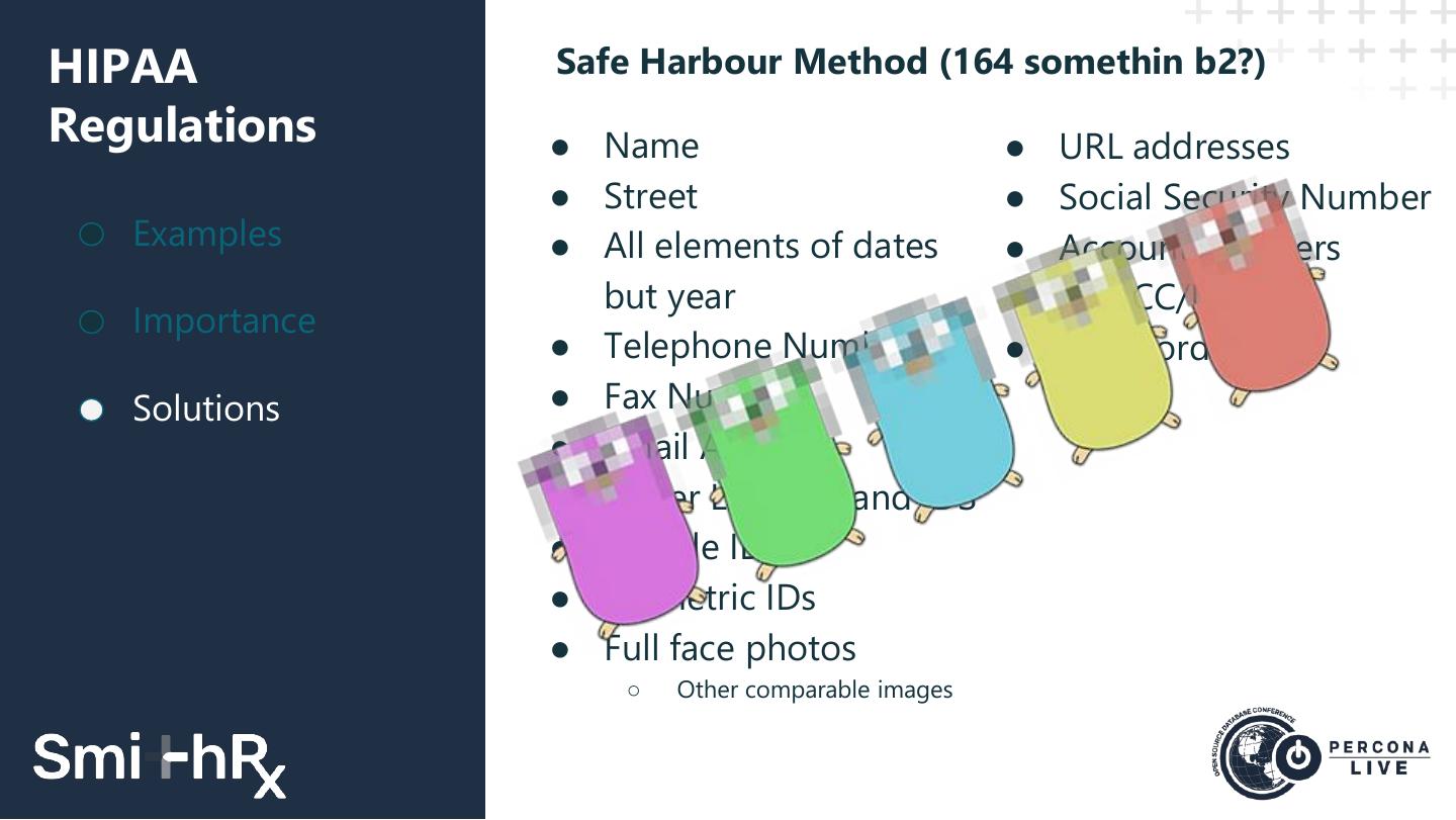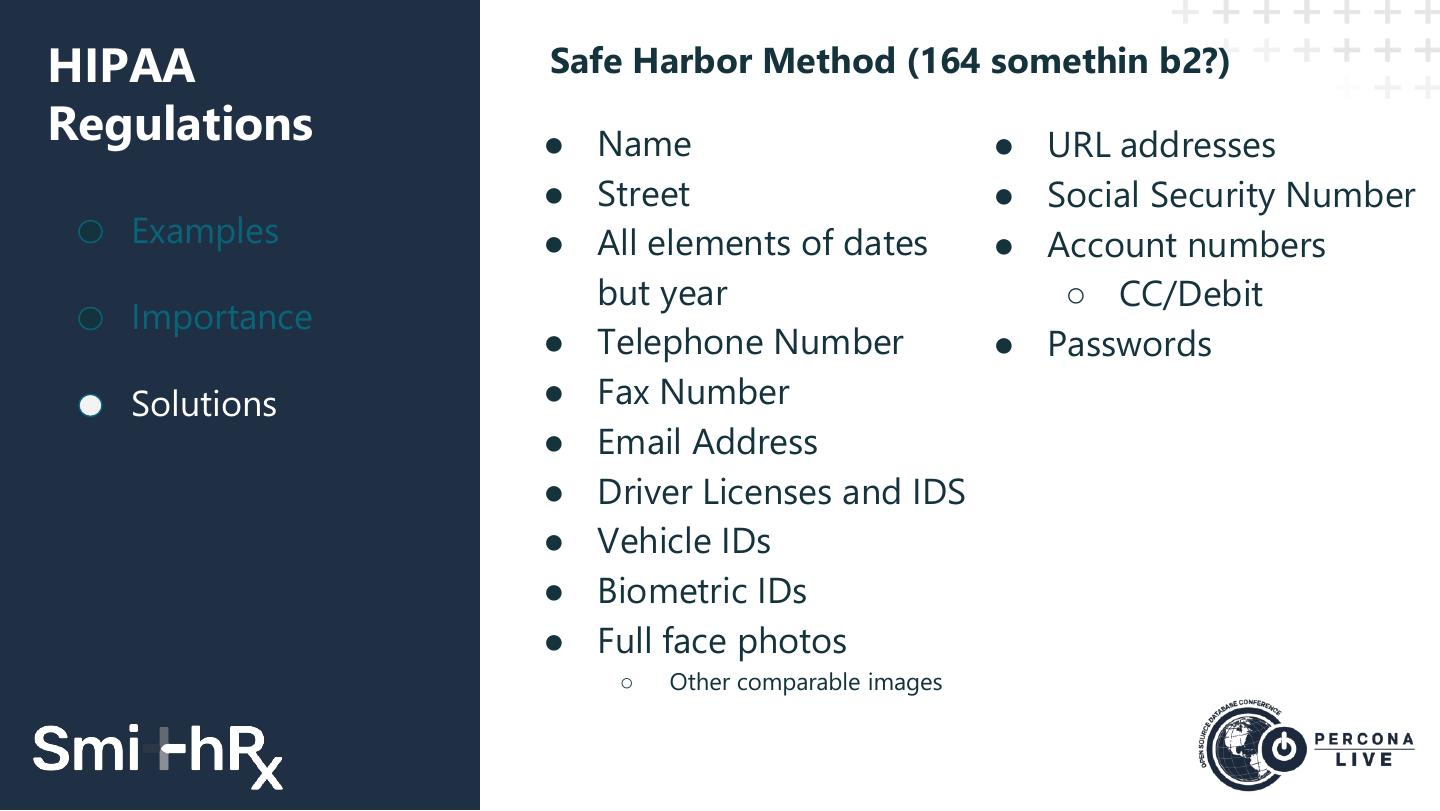 12 .HIPAA Safe Harbour Method (164 somethin b2?) Regulations ● Name ● URL addresses ● Street ● Social Security Number Examples ● All elements of dates ● Account numbers but year ○ CC/Debit Importance ● Telephone Number ● Passwords Solutions ● Fax Number ● Email Address ● Driver Licenses and IDS ● Vehicle IDs ● Biometric IDs ● Full face photos ○ Other comparable images