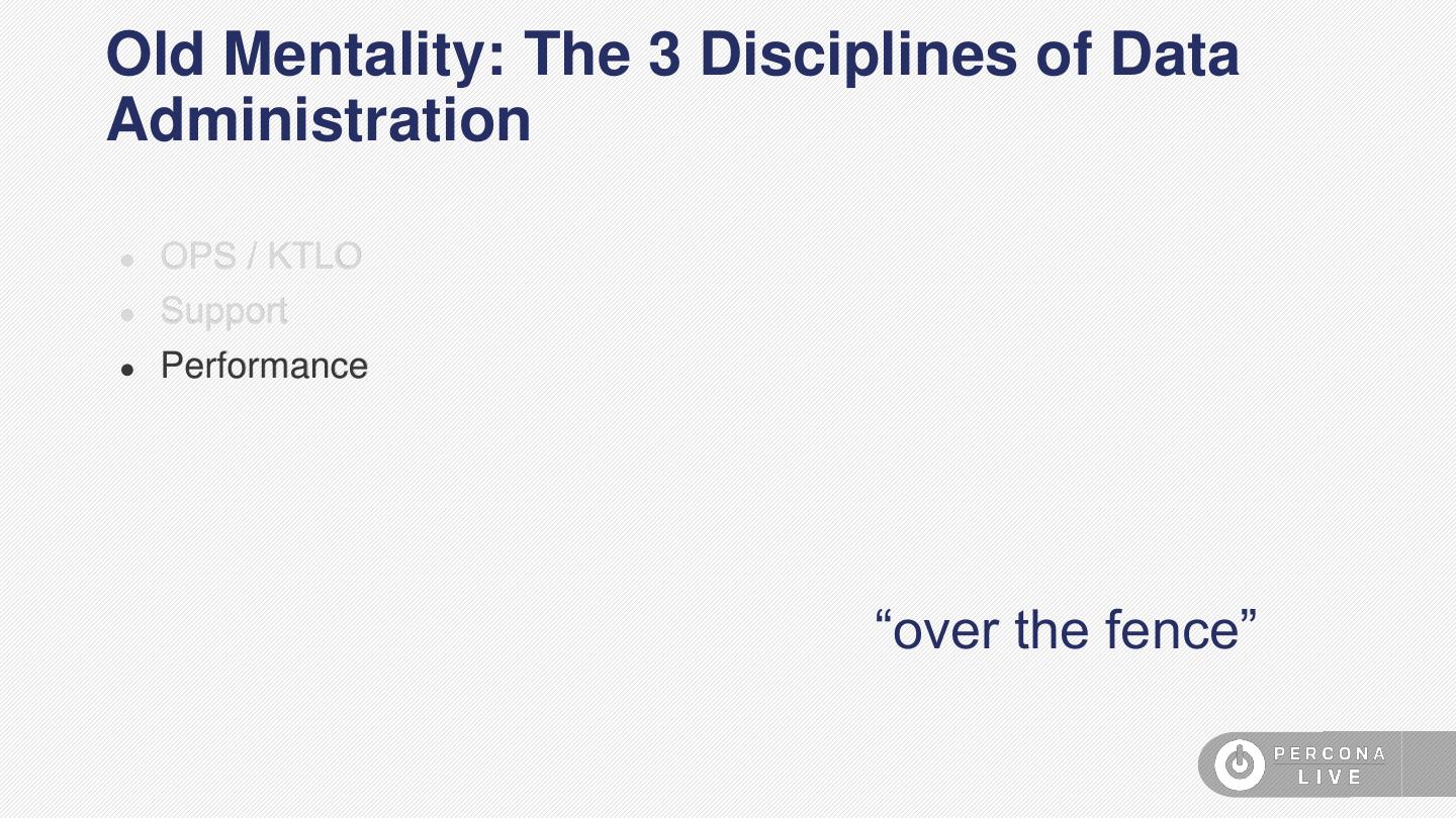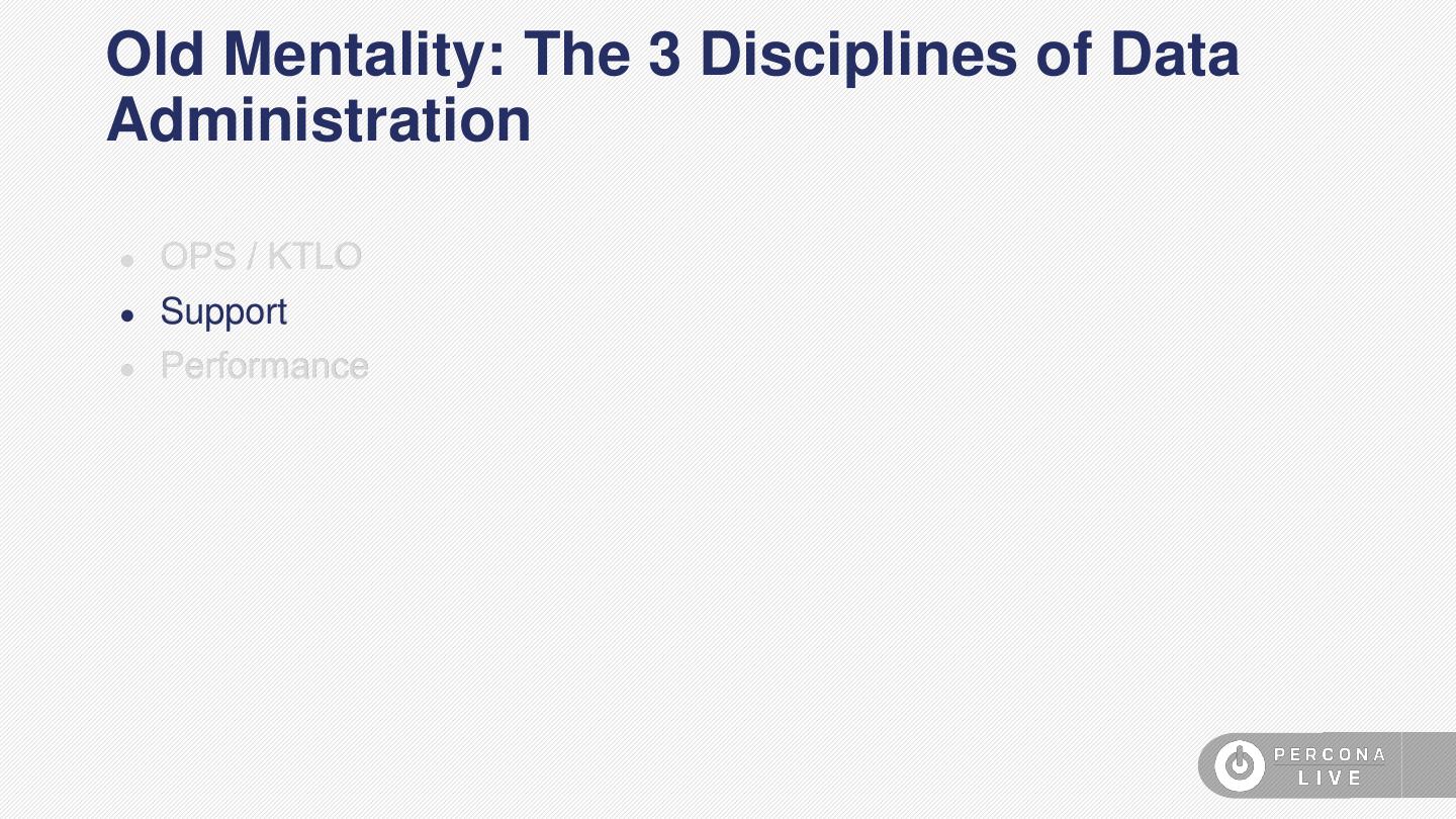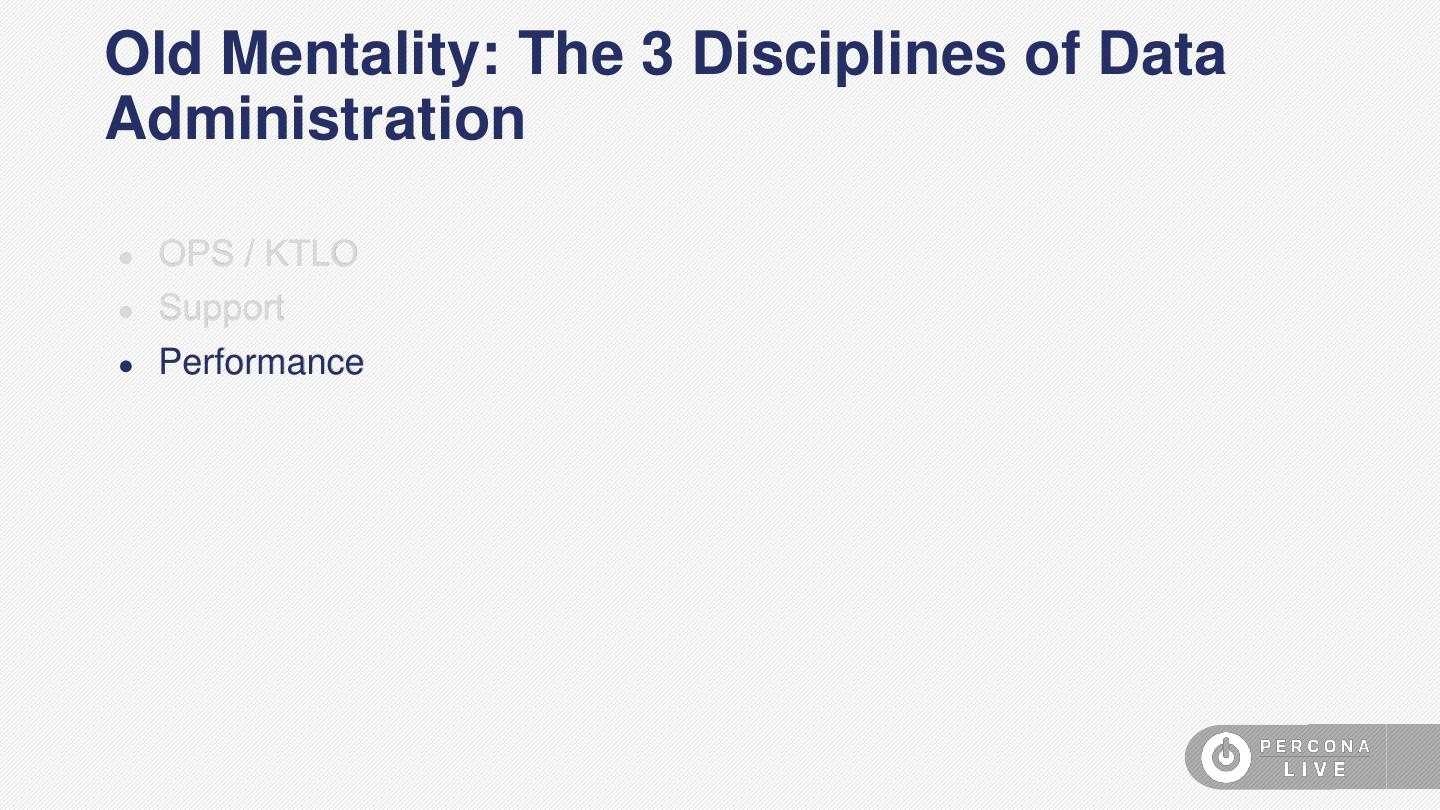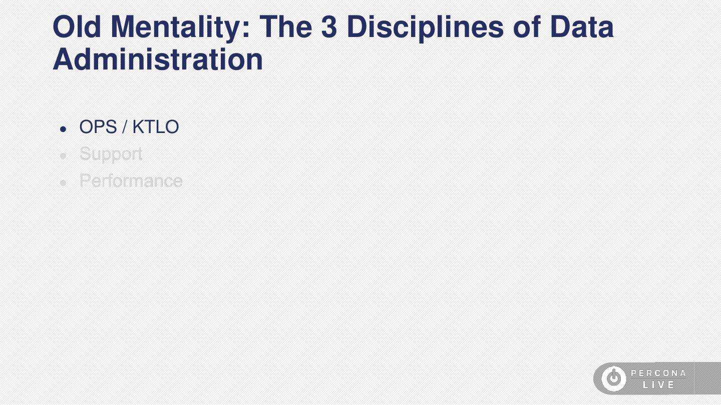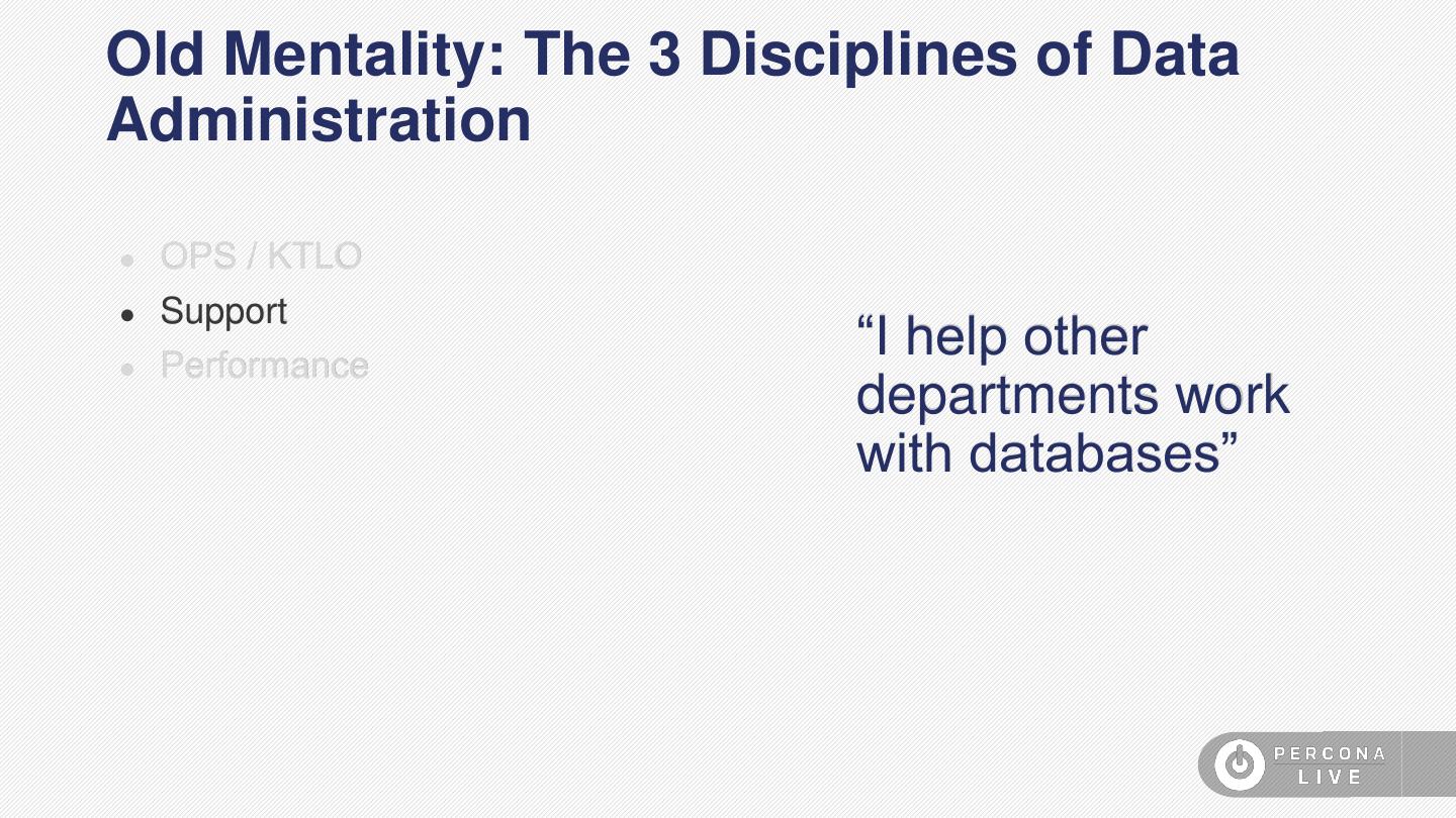 7 .Old Mentality: The 3 Disciplines of Data Administration ● OPS / KTLO ● Support ● Performance