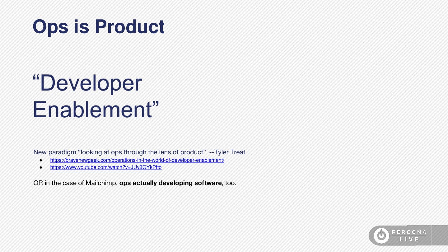 15 .Ops is Product “Developer Enablement” New paradigm “looking at ops through the lens of product” --Tyler Treat ● https://bravenewgeek.com/operations-in-the-world-of-developer-enablement/ ● https://www.youtube.com/watch?v=JUy3GYkPfto OR in the case of Mailchimp, ops actually developing software, too.