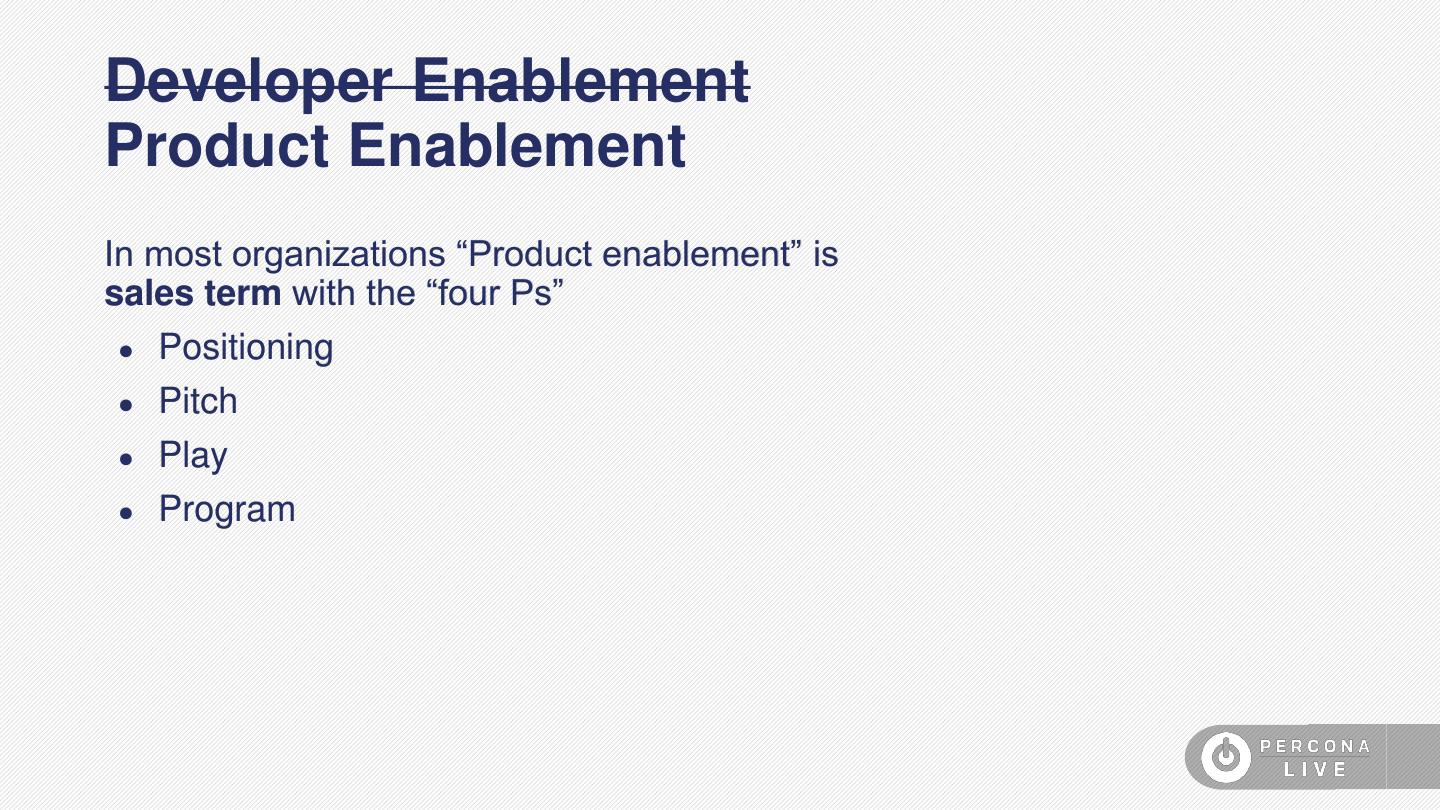 16 .Developer Enablement Product Enablement In most organizations “Product enablement” is sales term with the “four Ps” ● Positioning ● Pitch ● Play ● Program