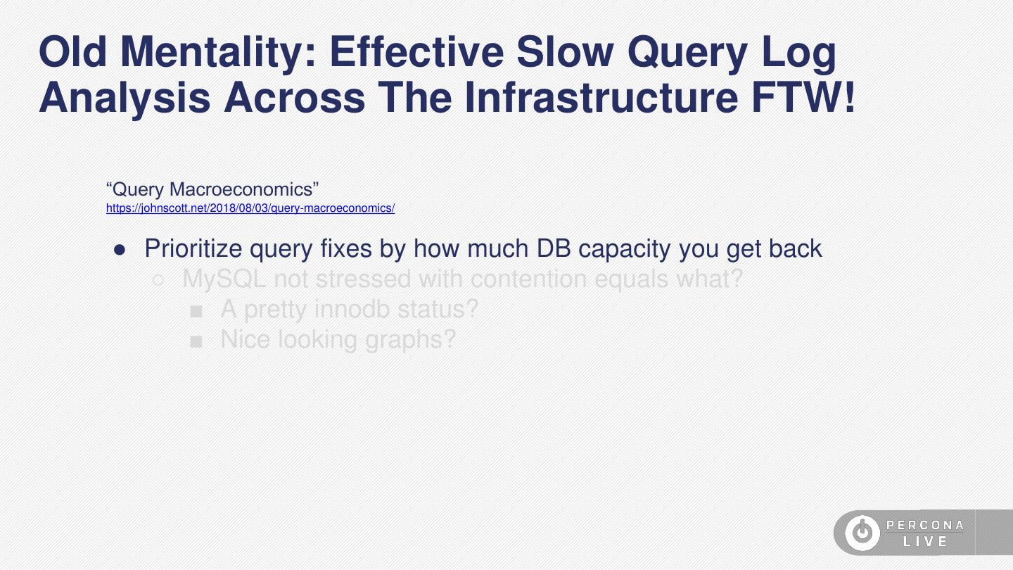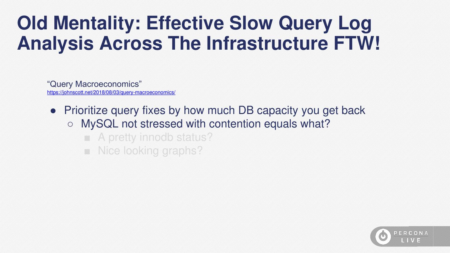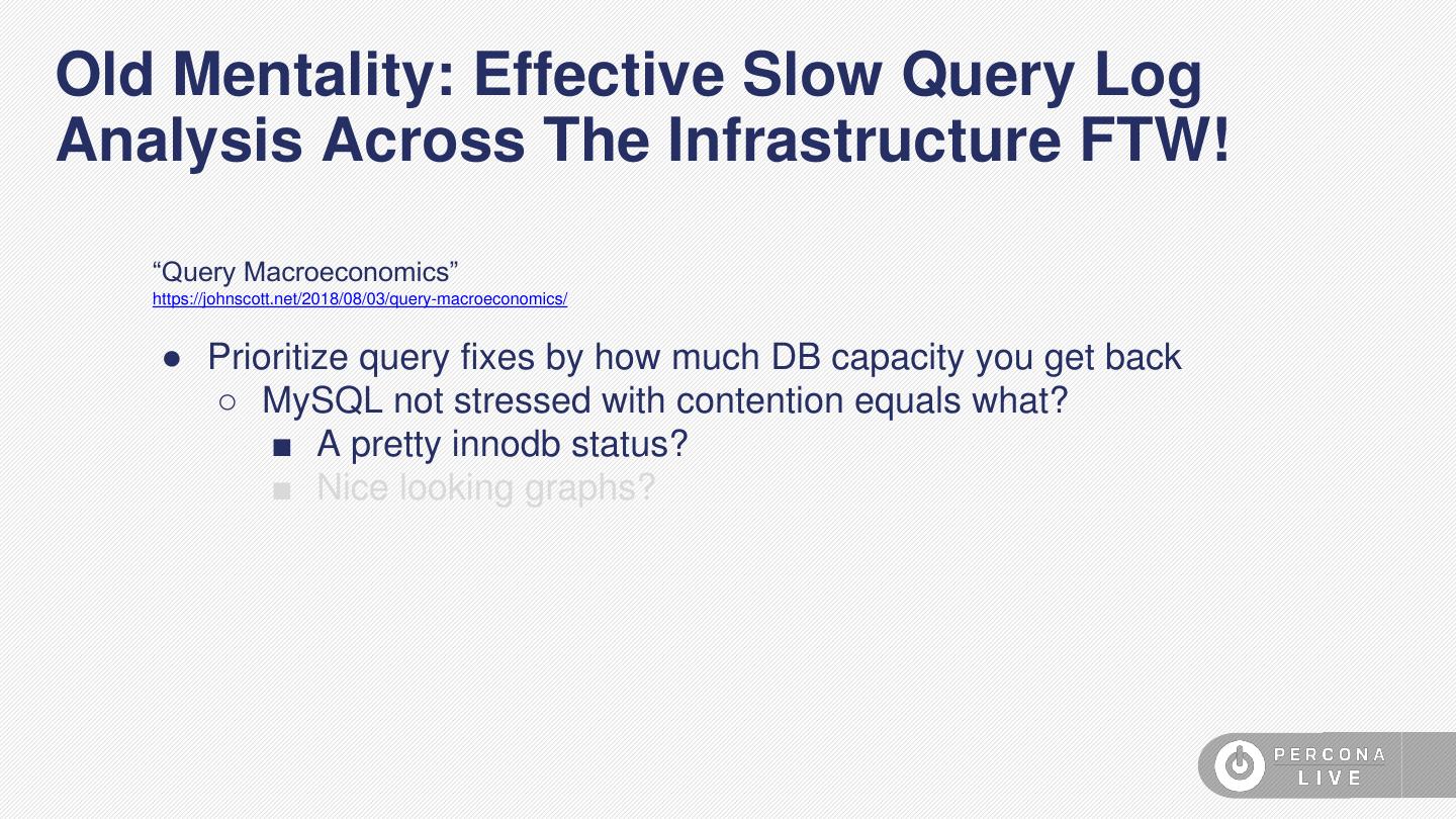 28 .Old Mentality: Effective Slow Query Log Analysis Across The Infrastructure FTW! “Query Macroeconomics” https://johnscott.net/2018/08/03/query-macroeconomics/ ● Prioritize query fixes by how much DB capacity you get back ○ MySQL not stressed with contention equals what? ■ A pretty innodb status? ■ Nice looking graphs?