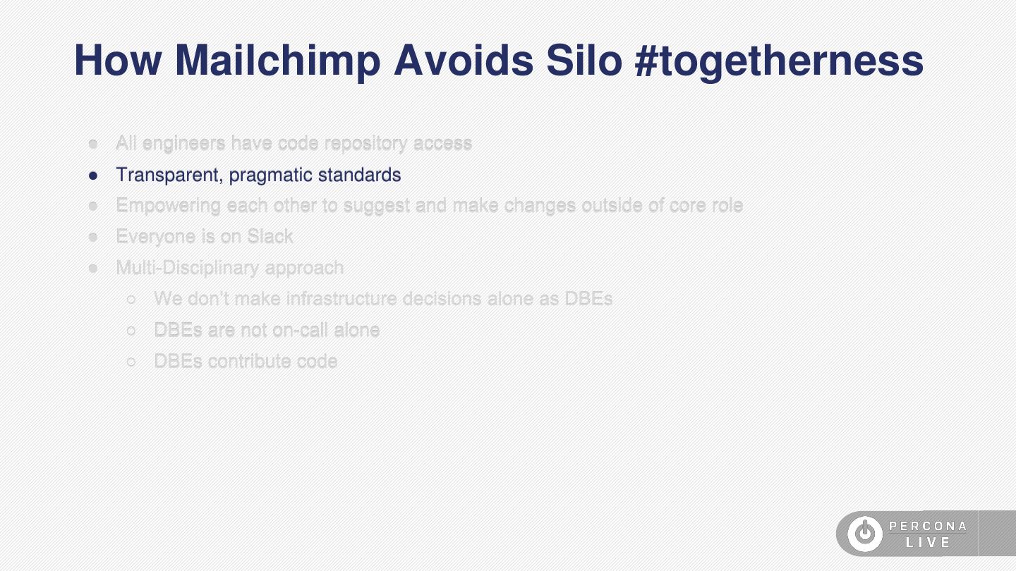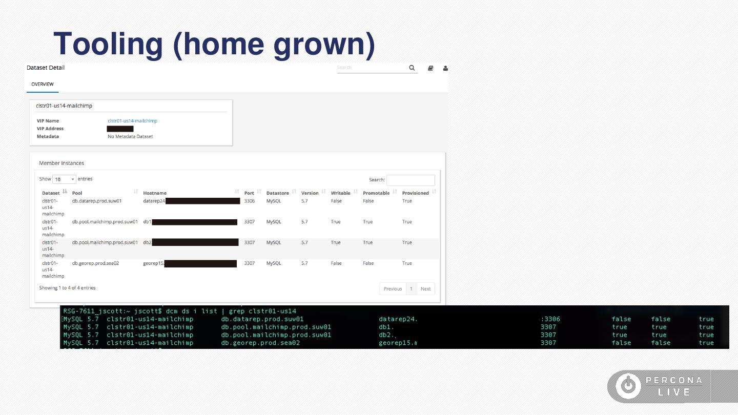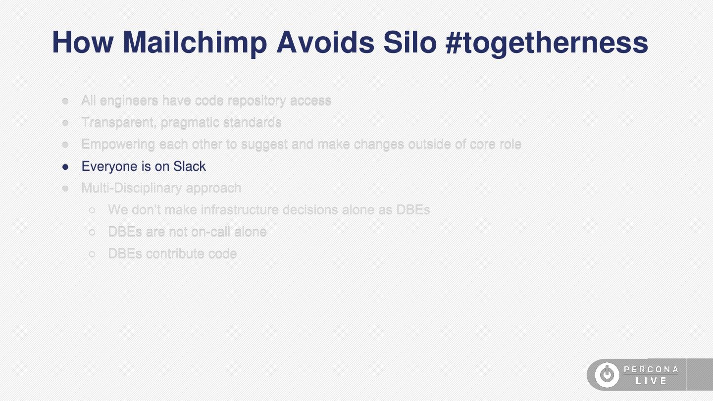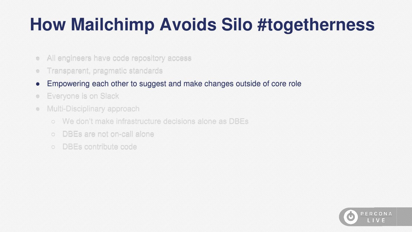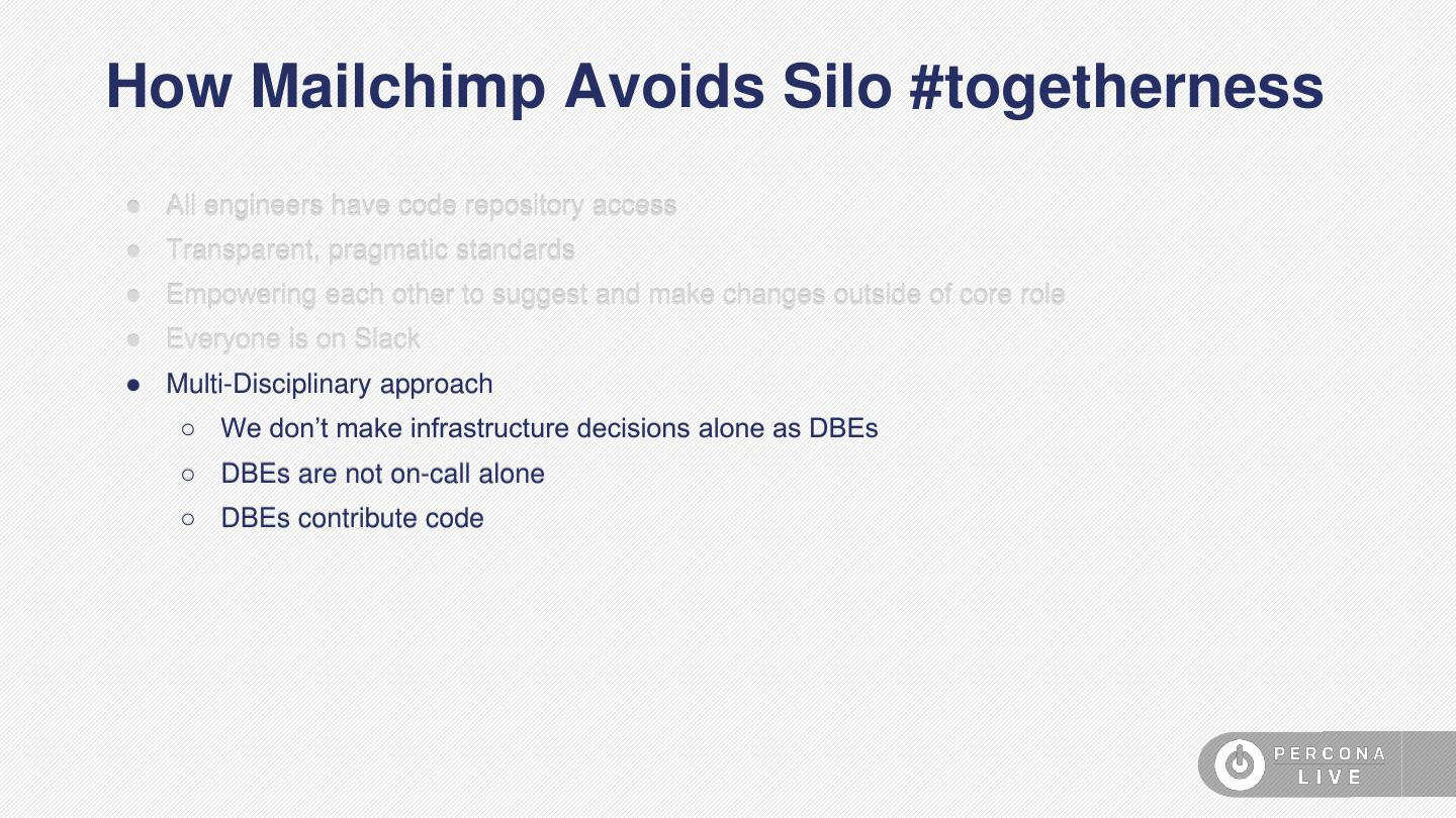 除了中小企业和企业外,mailchimp已经从一家小公司成长为服务于数以百万计的微型企业。对于MySQL,我们有一个相当普通的方法,但是现在我们运行了数百个,可能很快就会有数千个MySQL实例。我们现在的状态要归功于强大的全栈工程团队合作。这是一个让mailchimp滴答作响的一瞥。提示,这不仅仅是技术。这是关于“动力”和“实用主义”,并为我们赋予弱势群体权力的使命创造了一个伟大的成果。