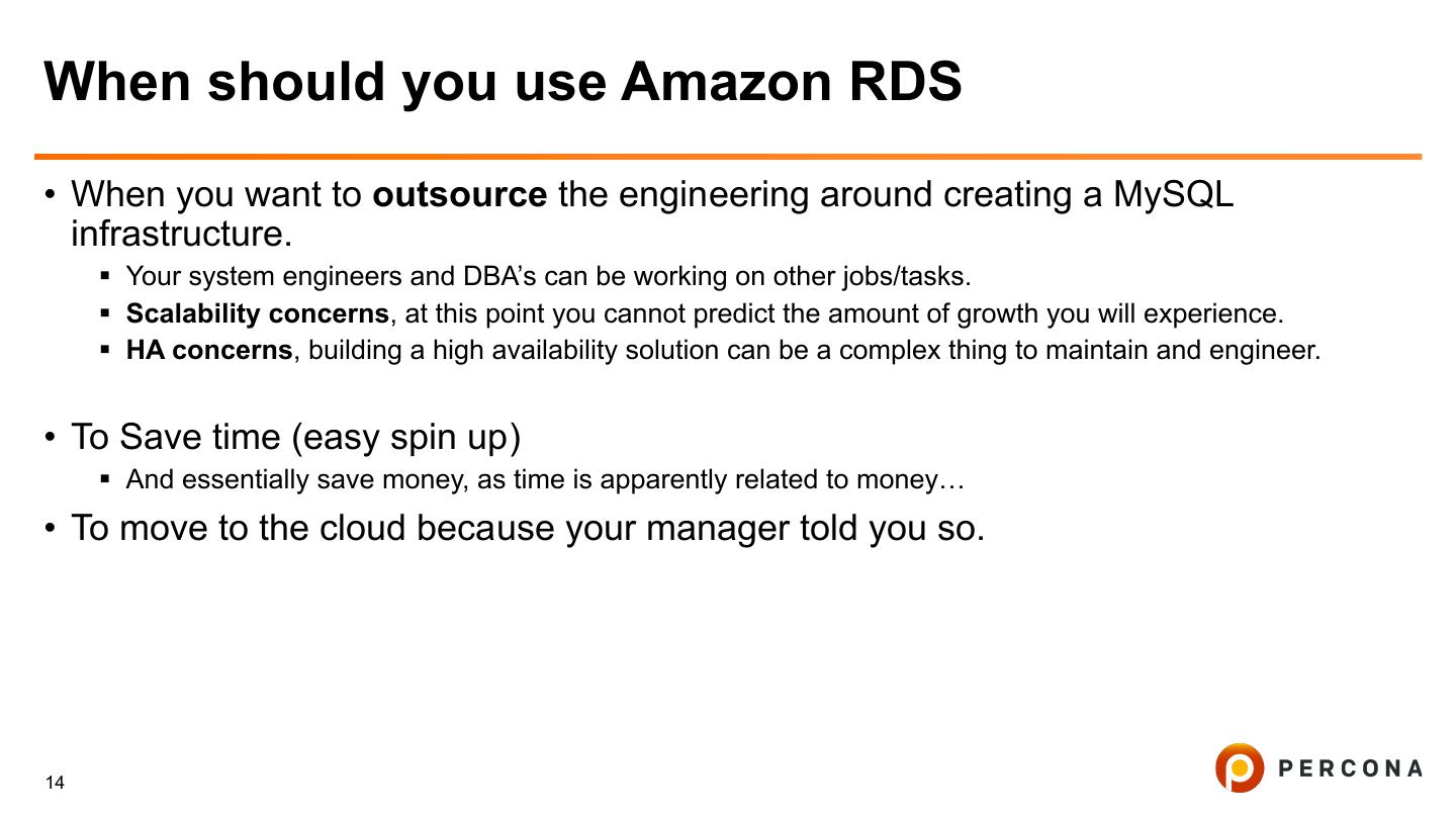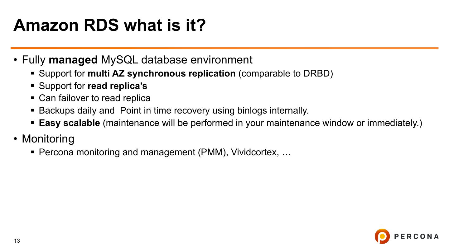 13 .Amazon RDS what is it? • Fully managed MySQL database environment § Support for multi AZ synchronous replication (comparable to DRBD) § Support for read replica’s § Can failover to read replica § Backups daily and Point in time recovery using binlogs internally. § Easy scalable (maintenance will be performed in your maintenance window or immediately.) • Monitoring § Percona monitoring and management (PMM), Vividcortex, … 13