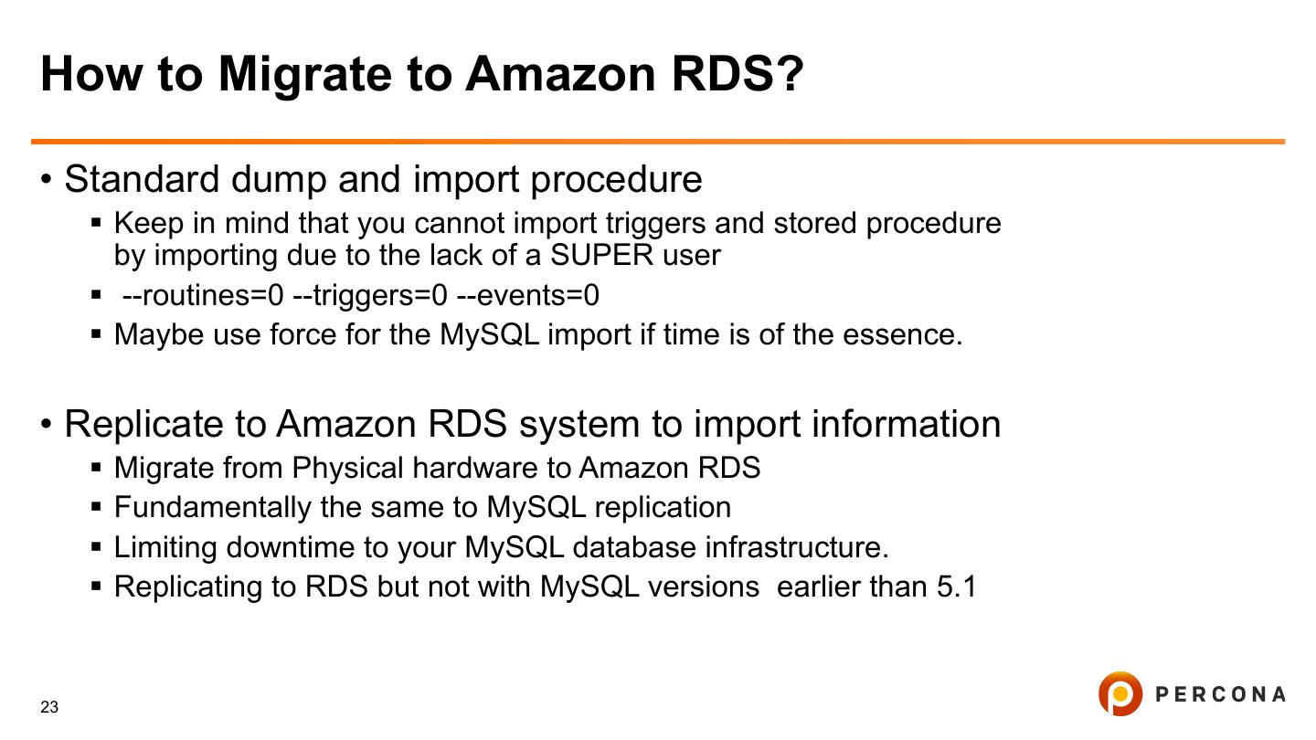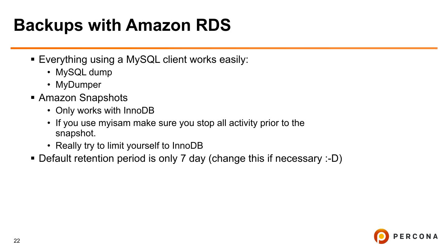 22 .Backups with Amazon RDS § Everything using a MySQL client works easily: • MySQL dump • MyDumper § Amazon Snapshots • Only works with InnoDB • If you use myisam make sure you stop all activity prior to the snapshot. • Really try to limit yourself to InnoDB § Default retention period is only 7 day (change this if necessary :-D) 22