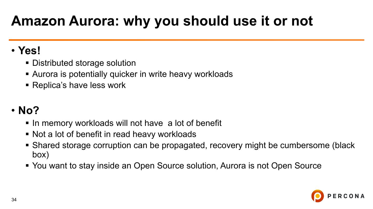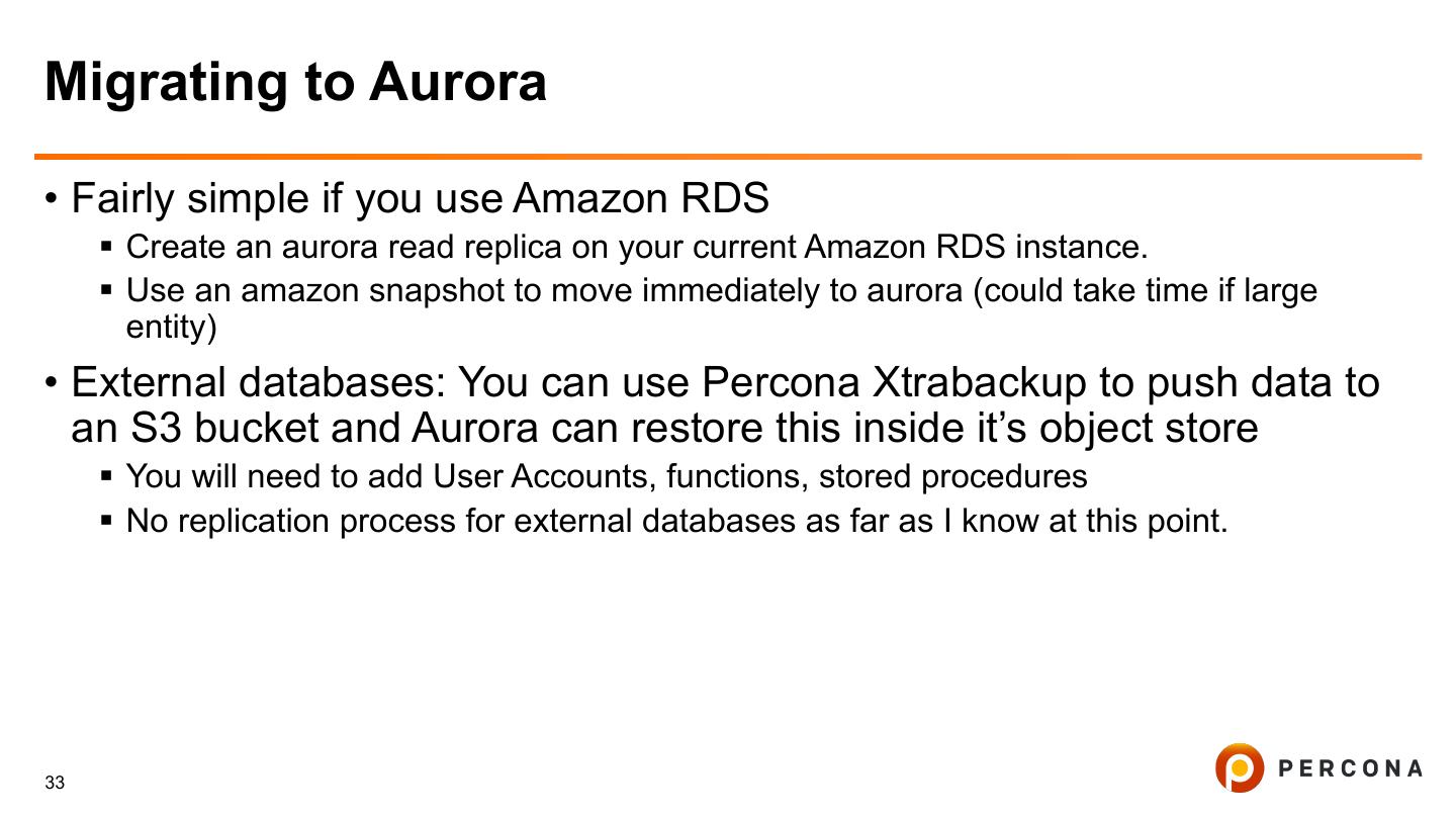29 .Replicating back out of RDS • You can replicate out of Amazon RDS towards for example an EC2 machine. • You will have to dump and restore the data though for the initial MySQL dump. • It’s probably going to be a more painful process so make sure if you choose to go the RDS product, you are sure about it’s capabilities and function. • Several Nines have an interesting blog post series about this situation just released this week: https://severalnines.com/blog/mysql-cloud-online-migration-amazon-rds-your-own- server-part-2 29