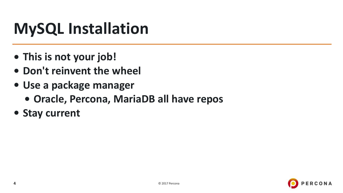 4 .MySQL Installation • This is not your job! • Don't reinvent the wheel • Use a package manager • Oracle, Percona, MariaDB all have repos • Stay current 4 © 2017 Percona