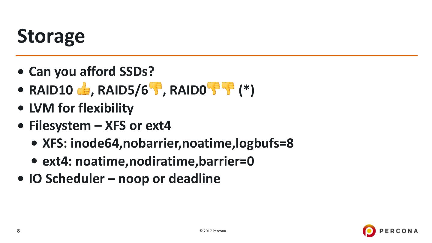 8 .Storage • Can you afford SSDs? • RAID10 👍, RAID5/6👎, RAID0👎👎 (*) • LVM for flexibility • Filesystem – XFS or ext4 • XFS: inode64,nobarrier,noatime,logbufs=8 • ext4: noatime,nodiratime,barrier=0 • IO Scheduler – noop or deadline 8 © 2017 Percona