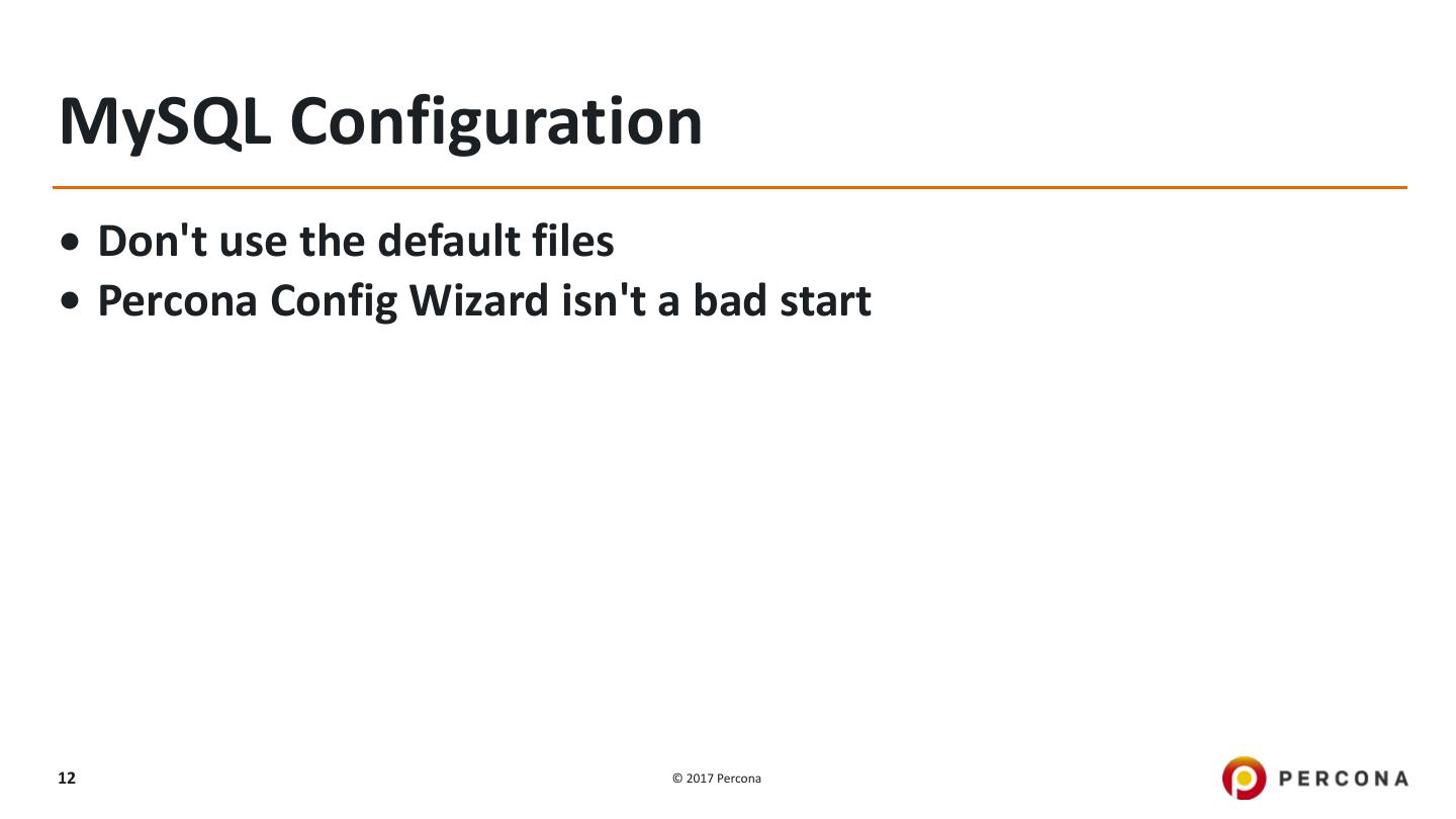 12 .MySQL Configuration • Don't use the default files • Percona Config Wizard isn't a bad start 12 © 2017 Percona