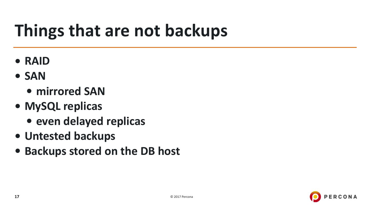 17 .Things that are not backups • RAID • SAN • mirrored SAN • MySQL replicas • even delayed replicas • Untested backups • Backups stored on the DB host 17 © 2017 Percona