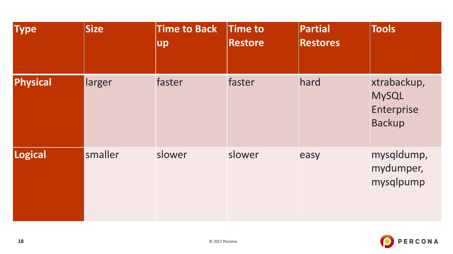 18 .Type Size Time to Back Time to Partial Tools up Restore Restores Physical larger faster faster hard xtrabackup, MySQL Enterprise Backup Logical smaller slower slower easy mysqldump, mydumper, mysqlpump 18 © 2017 Percona