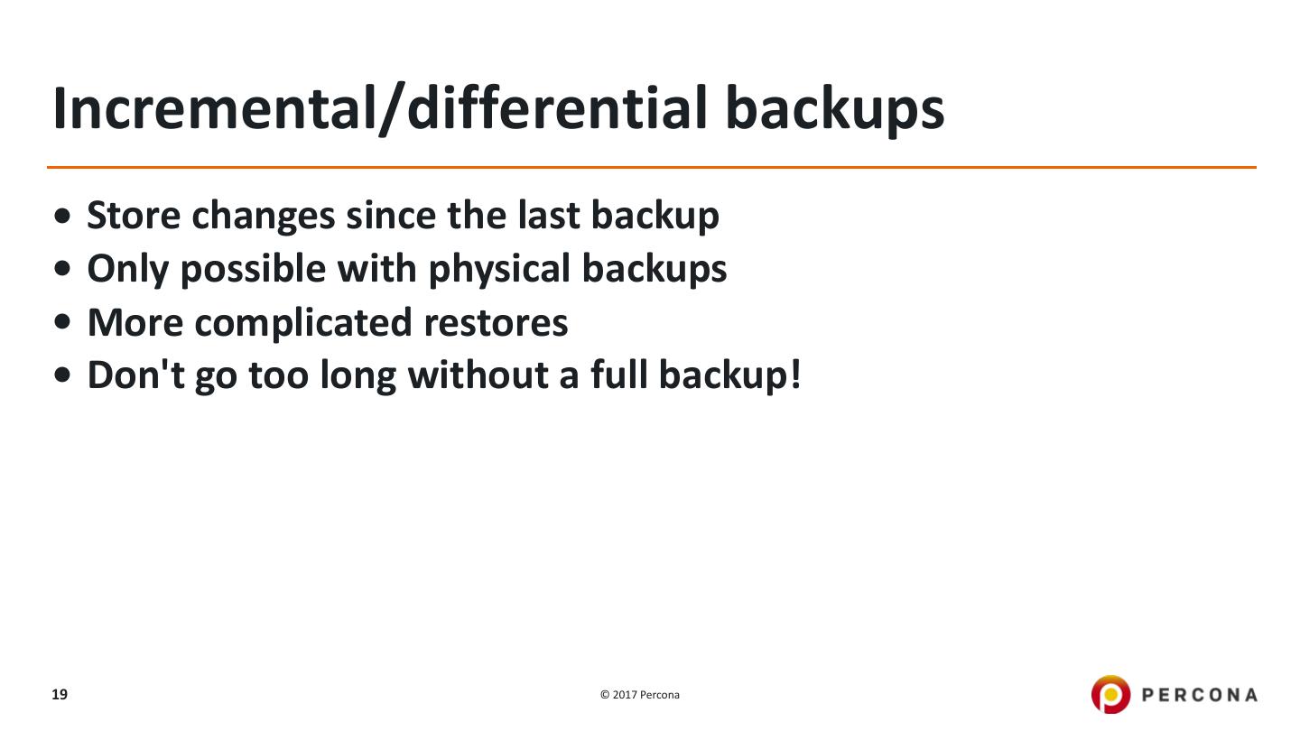 19 .Incremental/differential backups • Store changes since the last backup • Only possible with physical backups • More complicated restores • Don't go too long without a full backup! 19 © 2017 Percona